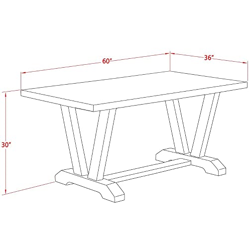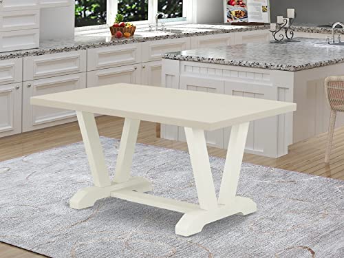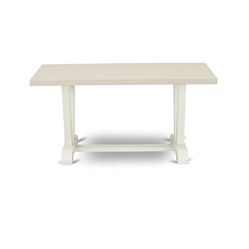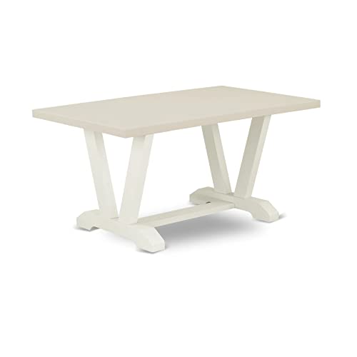 EAST WEST FURNITURE - VT026 - MODERN KITCHEN TABLEA magnificent dining room table brings a welcoming touch to kitchens and traditional living spaces alike. This exceptional V-shaped dining table promotes a sense of closeness among family members, while the frame of this rectangular kitchen table enhances the overall charm of your dining area. The wooden table features a tabletop in a calming Linen White shade, paired with V-shaped hardwood legs finished in Wire-brushed Linen White, giving it a unique and innovative look. This extraordinary kitchen table is a versatile addition to any kitchen and complements various dining room styles beautifully. Constructed using high-quality Asian wood, commonly known as rubberwood, it provides both stability and durability, meeting the expected standards for furniture. Furniture should endure the test of time without the need for frequent replacements. Our kitchen table is designed with convenience in mind, ensuring a quick and effortless assembly process. With its straightforward design, along with clear, step-by-step instructions and numbered parts, assembling the dining room table is a simple task that can be completed swiftly. You won't need to purchase additional equipment for installing this table, as everything you need is included.PRODUCT FEATURES: Material: Rubberwood Table Top: Rectangular Table Color: Linen White Table Dimensions: Length: 60; Width: 36; Height: 30.Package Include: A Rectangular Modern Kitchen Table