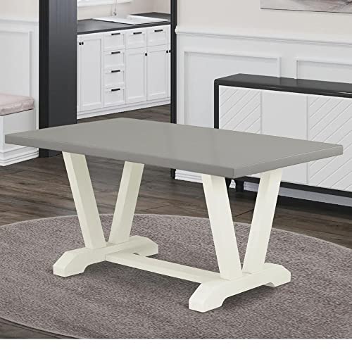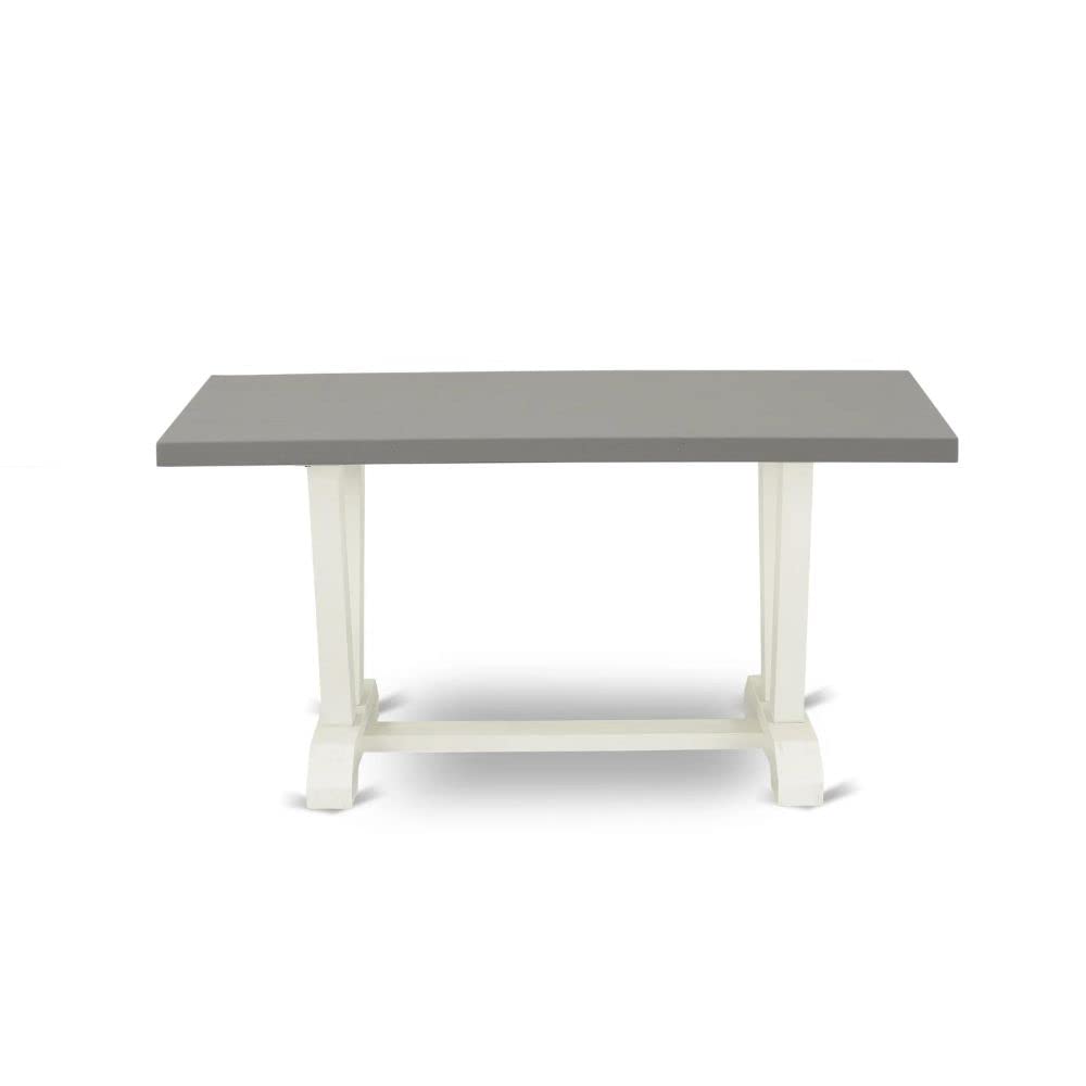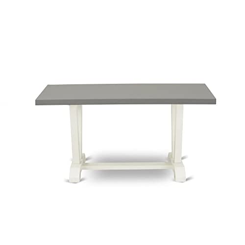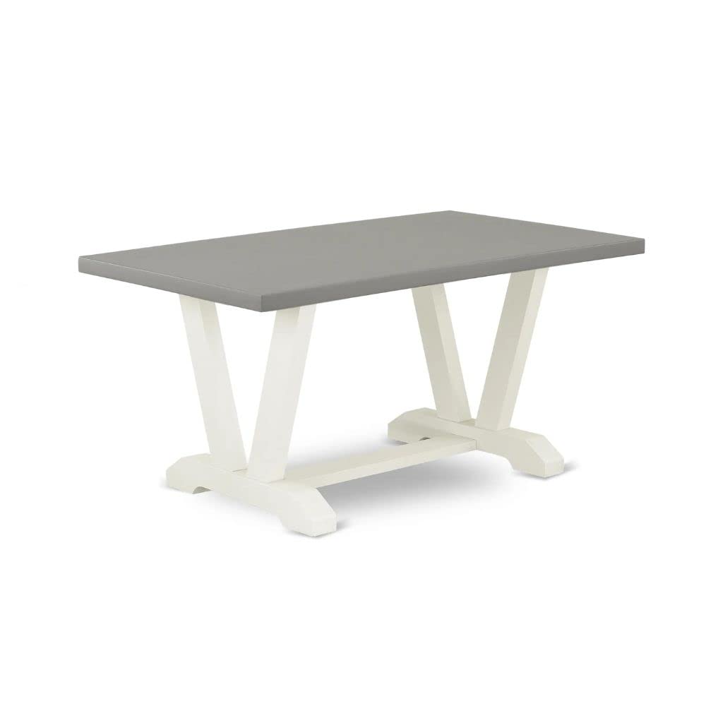 EAST WEST FURNITURE - VT096 - MODERN DINING TABLEThe compact dining table boasts a rectangular tabletop design that creates the illusion of more space in a room and fits perfectly into small kitchens or cozy apartments. This small table provides ample seating for a small family of up to four people. Featuring a rectangular tabletop with a cement finish and V-shaped legs finished in Linen White, this kitchen table radiates rustic charm, infusing a natural aesthetic into dining and kitchen areas. It harmoniously complements any existing room decor, enhancing its overall appeal. Crafted with a solid wood tabletop and base made from rubberwood, an Asian hardwood known for its durability and longevity due to its dense grain, this dining table is both eco-friendly and capable of withstanding shocks, ensuring its long-lasting presence in your home. Importantly, we have avoided using heat-treated wood, plywood, veneer, or laminated wood in the construction of this dining table to preserve its authenticity. The kitchen table is packaged in two boxes, one containing the tabletop and the other containing the V-shaped components. You can easily assemble it with minimal preparation by following the clear and straightforward installation instructions included in the package. All the necessary tools for assembling this kitchen table are also included.PRODUCT FEATURES: Material: Rubber wood Table Top: Rectangular Table Top Color: Cement Table Legs Color: Linen White Table Dimensions: Length: 60; Width: 36; Height: 30.Package Include: A Rectangular Modern Dining Table