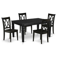 East West Furniture - Wecl5-Blk-W - Dining Room Setthe 5-Piece Dining Collection Consists Of Four Charming Kitchen Chairs And A Mid-Century Dining Table, Which Together Elevate The Elegance Of Your Dining Area. Our Dining Chairs And Wooden Kitchen Table Bring A Sleek And Contemporary Look To Your Dining Space, Effortlessly Complementing Various Decor Styles. The Beautiful Wooden Dining Table Boasts A Seamless Finish, Extending From Its Black Tabletop To Its Black-Coated Base, Ensuring A Durable And Unified Appearance. Its Versatile Design Harmonizes With A Wide Range Of Interior Decor Styles, Ensuring Its Lasting Appeal In Your Home For Years To Come. Additionally, The Black-Finished Wooden Legs Of The Comfortable Wood Dining Chairs Introduce A Touch Of Contemporary Style To Any Dining Setting. Crafted From High-Quality Asian Rubberwood, Our Dining Room Set Is Synonymous With Exceptional Durability, Strength, Stability, And Artisanal Craftsmanship. Meticulously Created By Skilled Carpenters, This Set'S Striking Aesthetic Elevates It To A Professional Standard. The Mid-Century Dining Chairs Feature Wooden Seats That Enhance The Overall Aesthetics Of Your Kitchen. The Spacious Seating Area Not Only Adds Comfort But Also Enhances The Dining Experience. Designed With A Comfortable Backrest, Our Dining Chairs Complement A Wide Range Of Decor Styles, From Rustic To Modern. The Smooth Wooden Seats Ensure A Comfortable And Satisfying Seating Experience For Your Guests.Product Features: Material: Asian Hardwood Table Color: Black Chair Color: Black Chair Dimensions: Length: 22; Width: 18; Height: 37. Table Dimensions: Length: 60/42; Width: 42; Height: 30.Includes In The Package: A Rectangular Table And 4 Wooden Chairs.