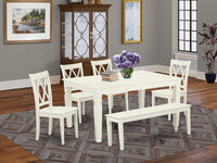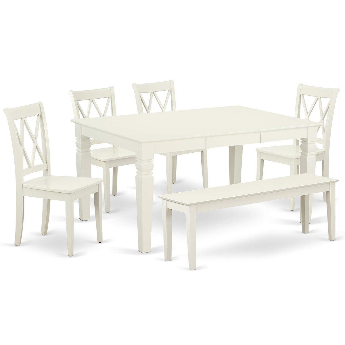 East West Furniture - Wecl6C-Lwh-W - Dining Room Setthis 6-Piece Exquisite Dining Set Creates A Warm And Affectionate Family Ambiance. The Comfortable And Luxurious Linen White Color Imparts A Relaxed And Inviting Atmosphere To Any Dining Room, Especially With The Addition Of The Small Kitchen Table. The Table'S Well-Designed And Comfortable Features, Including A Soft Rounded Bevel On The Tabletop, Allow For Extended Use. This Sleek Linen White Kitchen Table Complements Various Dining Room Styles. The Slender Double X Back Kitchen Chairs, Finished In A Rich Linen White Color With Wooden Seats, Offer Stylish And Cozy Seating. Crafted From Hardwood, These Chairs Provide Stability And An Elegant Finish, Enhancing Any Space They Occupy. The Chair Frames Are Designed For Excellent Lumbar Support, Reducing The Risk Of Back Pain. Their Color Coordination With The Table Adds A Pleasing Contrast To The Kitchen Area. The Linen White Finish Bench Matches Perfectly With The Table And Chairs, Elevating The Dining Area'S Overall Appeal. Its Standard Shape, Size, And Design Enhance The Visual Aesthetics Of The Space. This Contemporary, Budget-Friendly, Durable, And Comfortable Dining Set Is An Excellent Choice For A Memorable Dining Experience With Family Or Friends.Product Features: Material: Asian Hardwood Table And Bench Color: Linen White Chair Legs Color: Linen White Table Dimensions: Length: 60/42; Width: 42; Height: 30. Chair Dimensions: Length: 22; Width: 18; Height: 37. Bench Dimensions: Length: 51; Width: 15; Height: 18.Include In The Package: 4 Dining Room Chairs, A Dining Bench And A Dining Table.