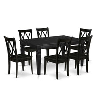 East West Furniture - Wecl7-Blk-W - Dining Room Setthis Mid-Century Dining Table Set Consists Of Seven Pieces, Featuring 6 Exceptional Kitchen Chairs And A Wooden Kitchen Table, Elevating The Appeal Of Your Kitchen. The Inclusion Of These Kitchen Chairs And The Dining Table Imparts A Notably Sleek And Modern Look To Your Dining Space. The Elegant Black Color Adds A Welcoming And Cozy Atmosphere To Any Dining Room When Paired With This Medium-Sized Kitchen Table. This Well-Crafted And Comfortable Kitchen Table Is Suitable For Extended Use, And It Is Not Constructed From Heat-Treated Pressured Wood Materials Like Mdf, Particle Board, Or Veneer Top. This Stylish Kitchen Table Is A Versatile Addition To Various Kitchen Styles And Dining Room Concepts. The Slender Double X-Back Kitchen Chairs, Finished In Black With Wooden Seats, Provide Both Fashionable And Comfortable Seating Options. Crafted From Hardwood, The Chairs Are Stable And Possess A Robust Finish. These Dining Room Chairs Bring An Element Of Elegance And Sophistication To Any Space They Occupy. The Chair Frames Are Designed To Offer Excellent Spinal Support, Reducing The Risk Of Back Pain. The Coordinated Color Scheme Between The Chairs And The Table Creates A Pleasing Contrast In The Kitchen Area. The Standard Shape, Size, And Design Significantly Enhance The Attractiveness Of The Dining Area. If You'Re Seeking A Contemporary, Budget-Friendly, Durable, And Comfortable Dining Set For Enjoyable Meals With Family And Friends, This Set Is An Excellent Choice.Product Features: Material: Asian Hardwood Color: Black Chair Seat: Wooden Chair Back: Double X Table Dimensions: Length: 60/42; Width: 42; Height: 30. Chair Dimensions: Length: 22; Width: 18; Height: 37.Include In The Package: 6 Dining Room Chairs And A Dining Table.