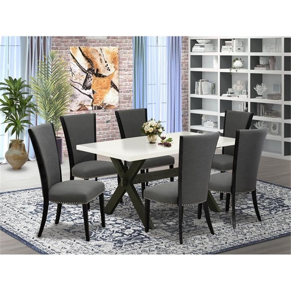 East West Furniture - X626VE650-7 - 7-Piece Mid Century Modern Dining Set: Our dinette set adds a touch of elegance to any dining room that you and your family will absolutely enjoy. The elegant 7 Piece modern dining set includes a dining table and 6 dining room chairs. This rectangular wood table top is offered in a Linen White finish. In addition, the dining chairs in a Dark Gotham Grey Linen Fabric enhance the elegance of any home. Ideal for dinette, kitchen and dining areas, this multi-functional modern dining table set seats up to 6 people, perfect for families to enjoy mealtimes together. A great addition to your dining area and a perfect ensemble that will strike your guests with its best impression. We have created these Dark Gotham Grey finish parson chairs and wood dining table with the help of highly experienced carpenters, who generate a smooth and high-end finish to this modern dining table set. Upholstered Dining chair of the modern dining set can be moved under the wooden dining table when you finish your meal, which our kitchen dining table set largely helps you save room space. Designed with easy and fast assembly in mind, each set comes conveniently flat packed with easy-to-follow instructions and all necessary tools included. Our premium quality kitchen table set is perfect for you and your dining area as well as the kitchen area. Our mid century dining set is quite simple to clean and always provides a good appeal. The mid century dining set adds a refined touch to even your most casual family dinners. Keep Enjoy With East West Furniture!Features:Includes: A wooden dining table and 6 upholstered dining chairs.Material: Rubberwood, linen fabricFinish: Dark gotham gray, linen white, black7-piece modern dining set: Our mid-century modern dining set consists of a modern dining table and 6 matching dining chairs.Bring modern and sophisticated design to any dining area with our mid-century dining set.This fabulous dining room set is a shining example of modern design and forward thinking.A dining table set is a great thing to upgrade your kitchen or dining room style.Dining set finish: We have designed modern dining set with a premium quality finish that produces a gorgeous appearance to any dining area.Our rectangular table has a linen white finish rectangular table top and wire brushed black wooden x-style legs.The upholstered dining chairs have included a dark gotham grey linen fabric seat and black finish wooden 4 legs.Our dining room table and kitchen chairs finish combination is matched with any room decor.Solid wood structure: This modern dining set is made from superior quality Asian wood material known as rubberwood.Our dining room table set durability is unmatched thanks to this good quality material that is used during manufacturing.No heat-treated wood, plywood, veneer or laminated wood has been used to construct this dinner table set.Its versatile style will complement just about any decor in your home for many years to come.Upholstered chair material: These upholstered chairs provide an attractive touch to your dining area with linen fabric seat and high chair back.The seat and backrest of the upholstered chairs are made of superior quality linen fabric.The linen fabric modern dining chairs will provide a touch of beauty to any home with a contemporary appearance.Our soft cushion and backrest make these parson dining chairs a pleasant sitting feeling.Upholstered chair back style: High back.Specifications:Table Dimensions: 30"H x 36"W x 60"DDining Chair Dimensions: 39"H x 21"W x 18"DProduct Weight: (Table) 87 lbs; (Chair) 35 lbsChair Weight Capacity: 300