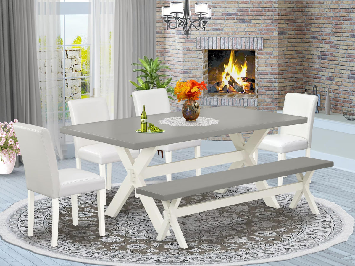 East West Furniture X097Ab264-6 6 Piece Modern Dining Table Set Contains A Rectangle Wooden Table With X-Legs And 4 White Faux Leather Parson Chairs With A Bench, 40X72 Inch, Multi-Color
