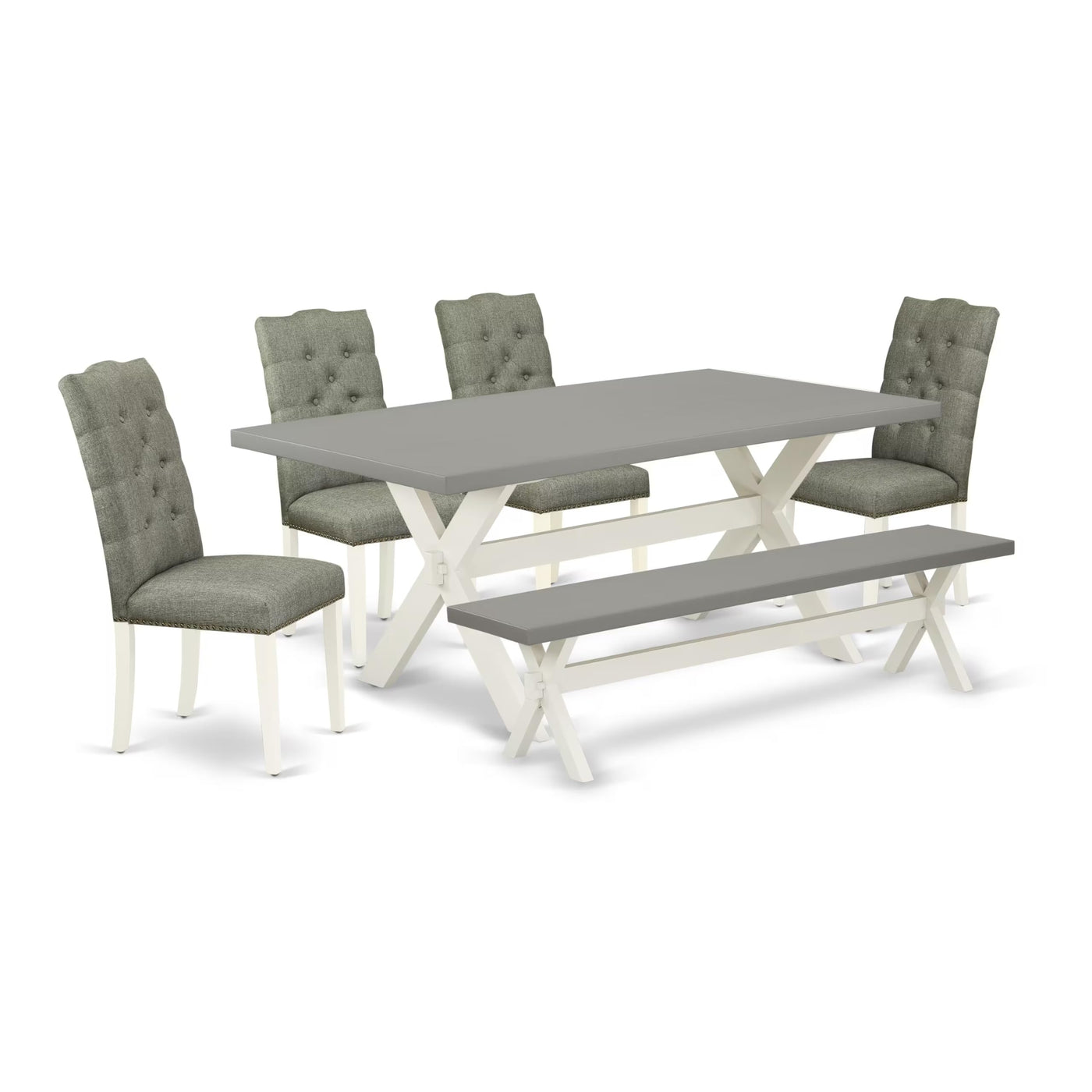 East West Furniture - X097El207-6 - 6-Piece Modern Dining Setthis Set Consists Of A Rectangular Table, An Elegant Dining Bench, And 4 Charming Parson Chairs, Collectively Enhancing Your Dining Room'S Aesthetic Appeal. The 6-Piece Kitchen Dining Room Set Introduces Modern Style With A Distinct Glossy Finish, Featuring Rectangular Tops For Both The Dining Bench And Table. The Mid-Century Dining Chairs Offer Meticulous Upholstery And Smoke-Colored Button Tufted Chair Backs, Seamlessly Blending Style And Comfort To Elevate Your Dining Space. The Wooden Dining Table Exudes Elegance With Its Rectangular Cement Top And Wire Brushed Off-White Wooden Cross Legs. The Mid-Century Dining Chairs Feature Off-White Finish Frames, Linen Fabric Seats, And Smoke-Colored Button Tufted Chair Backs. The Stunning Dining Table Bench Combines A Cement Top With Wire Brushed Off-White Legs. Both The Rectangular Dining Table And Wooden Bench Feature Rectangular Tops And Sturdy Wooden Cross Legs, Prioritizing Comfort With Smoke Linen Fabric Seats, Button Tufted Chair Backs, And A Robust Structure. The Classic Design Of This Dining Table Set Complements Various Decor Styles While Ensuring A Comfortable Dining Experience.Product Features: Set Material: Asian Hardwood Seating Material: Linen Fabric Table And Kitchen Table Bench Top Color: Cement Table And Kitchen Table Bench Legs Color: Wire Brushed Off-White Chairs Legs Color: Off-White Chairs Fabric Color: Smoke Table Dimensions: Length: 72; Width: 40; Height: 30. Chairs Dimensions: Length: 24.5; Width: 19; Height: 40.5. Table Bench Dimensions: Length: 72; Width: 15; Height: 18.Included In The Package: This Dining Table, A Table Bench And 4 Dining Chairs.