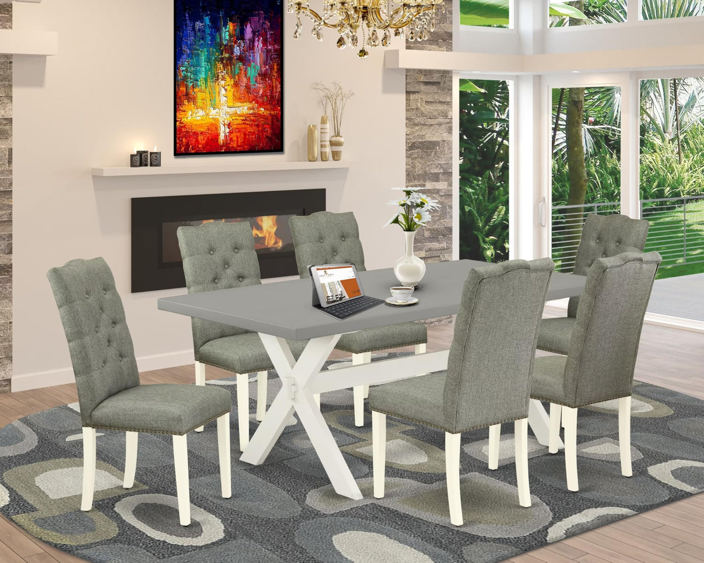 East West Furniture - X097El207-7 - 7-Pc Kitchen Room Setthis Set Comprises A Dining Table And 6 Elegant Kitchen Parson Chairs, Enhancing Your Dining Room'S Charm. The 7-Piece Dining Room Table Set Introduces Modern Style With A Glossy Finish, Featuring A Rectangular Tabletop And Upholstered Seat Dining Chairs For A Touch Of Sophistication. The Dining Table Stands Out With Its Rectangular Cement Top And Wire Brushed Off-White Wooden Cross Legs. Our Upholstered Dining Chairs Exhibit Off-White Finished Frames, Linen Fabric Seats, And Smoke-Colored Button Tufted Chair Backs. This Exquisite Modern Rectangular Dining Table, Combined With The Upholstered Dining Chairs, Creates A Cohesive And Elegant Dining Space. The Seats And Button Tufted Chair Backs Of These Parson Dining Room Chairs Are Meticulously Crafted From Linen Fabric, Seamlessly Harmonizing With The Wooden Frames In The Padded Parson Chairs. The Asian Wood Frame Of Our Kitchen Table Ensures Exceptional Stability. The Modern Rectangular Dining Table Boasts A Rectangular Top And Sturdy Wooden Cross Legs. These Mid-Century Dining Chairs Prioritize Comfort With Smoke Linen Fabric Seats, Button Tufted Chair Backs, And A Robust Structure. The Classic Design Of This Dining Table Set Seamlessly Complements Various Decor Styles While Providing A Comfortable Dining Experience.Product Features: Set Material: Asian Hardwood Seating Material: Linen Fabric Table Top Color: Cement Table Legs Color: Wire Brushed Off-White Chairs Legs Color: Off-White Chairs Fabric Color: Smoke Table Dimensions: Length: 72; Width: 40; Height: 30. Chairs Dimensions: Length: 24.5; Width: 19; Height: 40.5.Included In The Package: One Excellent Breakfast Table And 6 Beautiful Dining Padded Chairs.