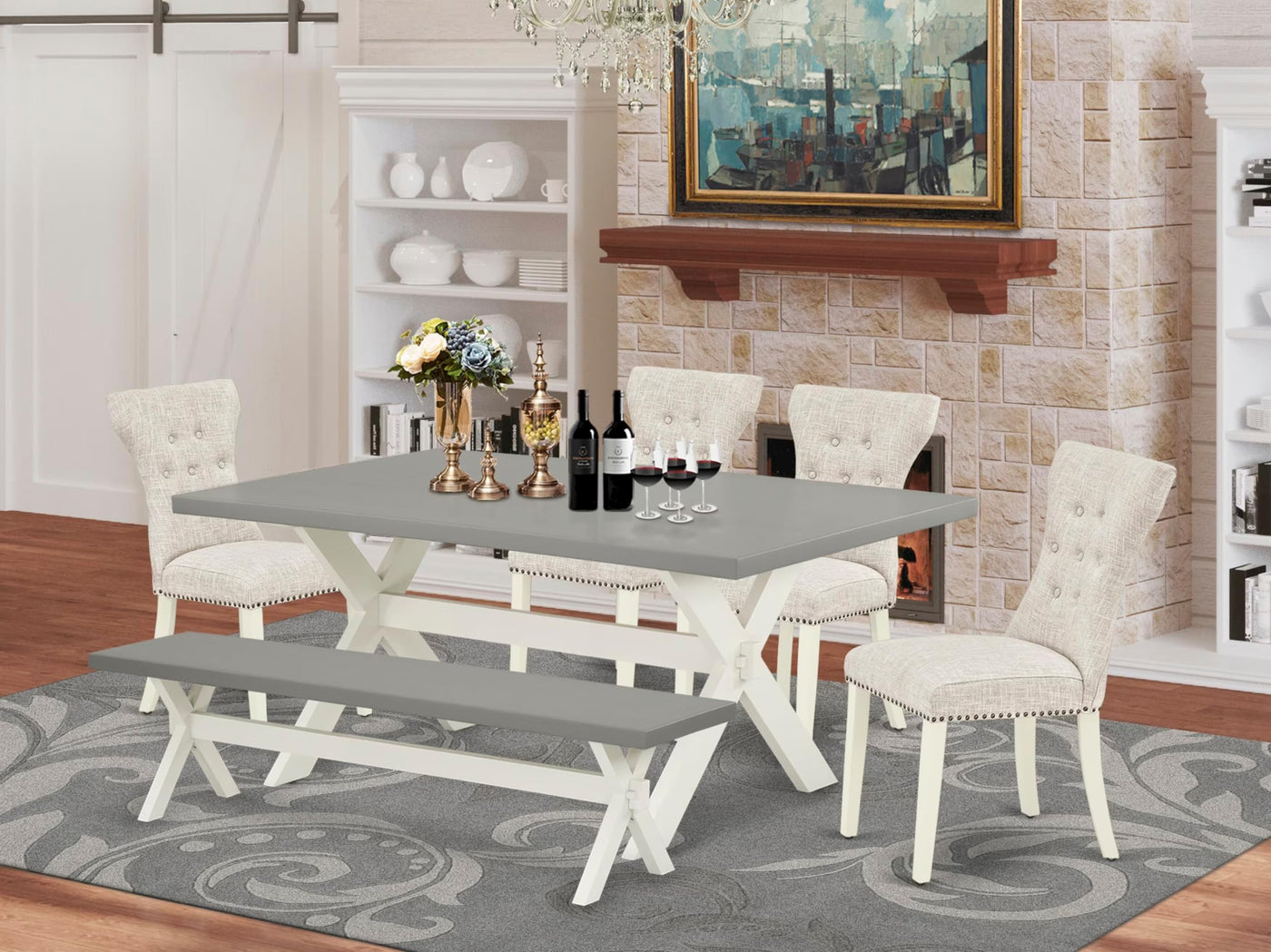 East West Furniture - X097Ga235-6 - 6-Pc Dining Room Setour 6-Piece Dining Table Set Includes 4 Parson Dining Chairs, 1 Dining Room Table And A Kitchen Table Bench. These Dining Room Chairs Have A Linen Fabric Seat, Button Tufted Chair Back, And The Wood Dining Table Includes A Rectangular Top And Wooden Cross Legs. The Mid Century Dining Chairs Seat And The Chair Back Is Built From Linen Fabric In A Doeskin Color Parson Chairs Hardwood Structure And The Linen Fabric Seat Is Very Easy To Clean. You Can Clean Dirt Easily And Often To Save Time By Using A Damp Cloth. These Upholstered Dining Chairs And The Breakfast Table Is The Great Choice For Your Dining Room Or Kitchen. A Simple Frame Of The Parson Dining Room Chairs And The Breakfast Table As Well As Screws Of The Same Size That Allow Fast And Simple Setup.Product Features:Dining Table Set Material: Asian Hardwoodseating Material: Linen Fabricrectangular Table And Mid Century Modern Bench Top Color: Cementdining Table And Wood Bench Legs Color: Wire Brushed Off-Whitemid Century Dining Chairs Legs Color: Off-Whiteparson Dining Chairs Fabric Color: Doeskinmodern Dining Room Table Dimensions: Length: 72; Width: 40; Height: 30Upholstered Dining Chairs Dimensions: Length: 23; Width: 18; Height: 36.Dining Room Bench Dimensions: Length 72; Width 15; Height 18.Included In The Package: One Awesome Rectangular Table, A Dining Room Bench And 4 Beautiful Mid Century Dining Chairs.