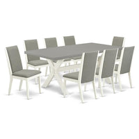 East West Furniture - X097La206-9 - 9-Piece Kitchen Table Setthis Kitchen Set Includes 8 Gorgeous Padded Parson Chairs And An Awesome Kitchen Rectangular Table. This Wood Dining Table Is Offered In An Elegant Wire Brushed Linen White Finish. In Addition, The Dining Room Chairs In A Shitake Linen Fabric To Enhance The Elegance Of Any Kitchen Or Dining Room. Our Modern Dining Table Set Delivers Great Durability Because This Dining Table Is Built From High Quality Asian Wood Which Can Bear The Weight Of 300 Lbs. We Have Created These Upholstered Dining Chairs And Wood Table With The Help Of Highly Experienced Carpenters, Who Generate A Smooth And High-End Finish To This Kitchen Table Set. We Try To Offer Innovative As Well As Easy To Assemble Products. Our High-Quality Dining Room Set Is Perfect For You And Your Beautiful Dining Room As Well As The Kitchen Area. You Can Use It For Casual Home Parties Or Intimate Gatherings. Keep Enjoying East West Modern Furniture!Product Features: Color Of Dining Chairs Seat: Shitake Color Of Kitchen Rectangular Table Top: Cement Color Of Kitchen Rectangular Table Base: Wire Brushed Linen White Kitchen Chairs Legs Color: Wire Brushed Linen White Rectangular Dining Table Dimensions: Length: 72; Width: 40; Height: 30. Kitchen Chairs Dimensions: Length: 22; Width: 20; Height: 39Package Includes: 8 Padded Parson Chairs And A Dining Table.