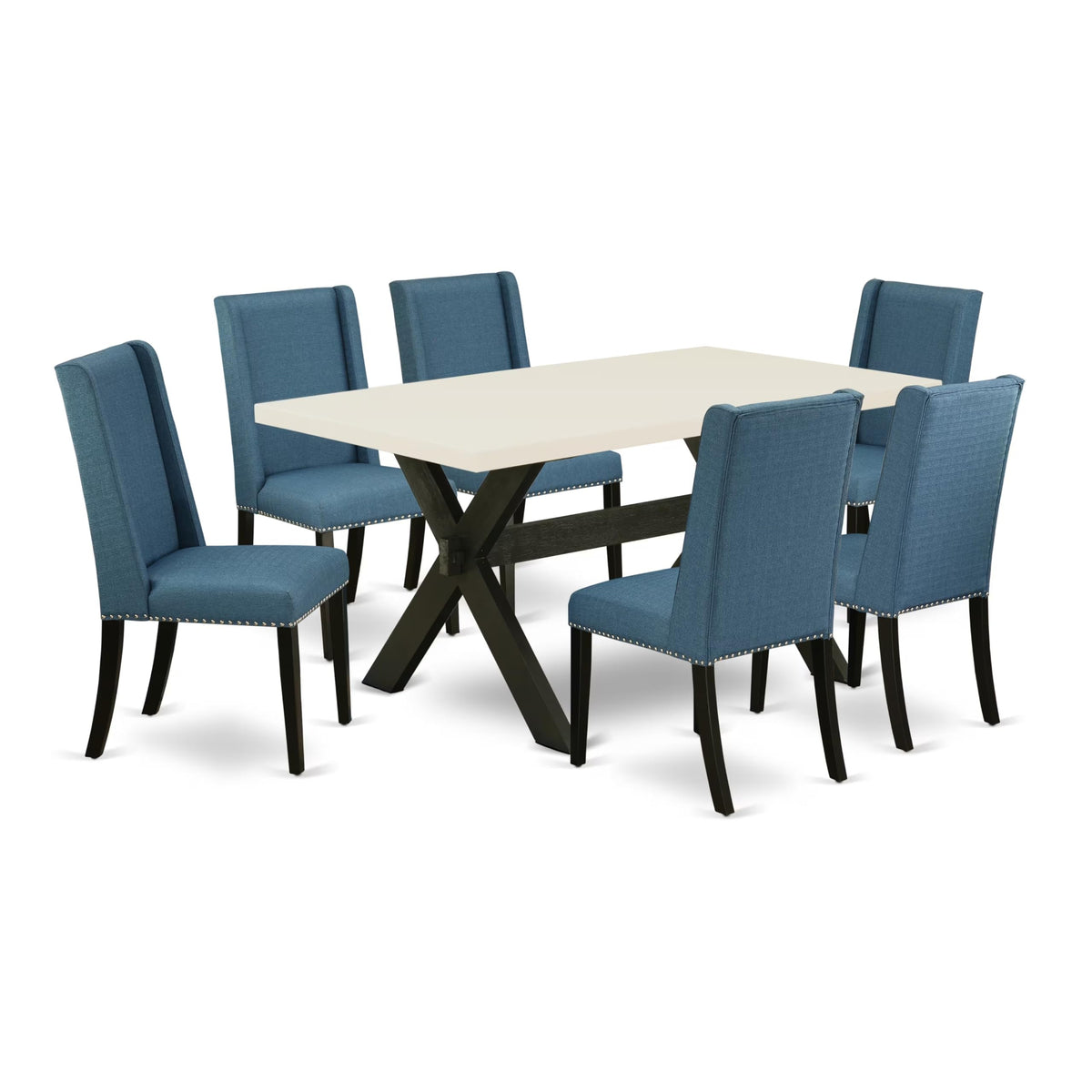 East West Furniture - X626Fl121-7 - 7-Pc Kitchen Setthis Elegant 7-Piece Dining Table Set Includes 6 Luxurious Parson Chairs With Plush Padding And A Beautiful Wooden Dining Table. The Dining Table Features An Exquisite Off-White Rectangular Tabletop Paired With Wire Brushed Black Wooden Legs, While The Parson Chairs Are Adorned With Mineral Blue Linen Fabric And Have Matching Wire Brushed Black Wooden Legs. Our Contemporary Dining Set Offers Outstanding Comfort With Its Well-Cushioned Chair Seats And Backs, And The Dining Table Effortlessly Complements Any Kitchen Decor. Crafted With A Strong Focus On Durability, Our Dining Room Ensemble Is Made From High-Quality Asian Wood Capable Of Supporting A Weight Of Up To 300 Lbs. Skilled Carpenters Have Meticulously Designed These Modern Dining Chairs And The Table, Resulting In A Flawless And Upscale Finish For This Kitchen Table Set. We Are Committed To Delivering Innovative And Easily Assembled Products. Our Premium Kitchen Set Is A Perfect Addition To Your Sophisticated Dining Room Or Kitchen Space, Suitable For Both Casual Home Gatherings And Intimate Soirées. Embrace The Excellence Of East West Modern Furniture!Product Features: Chairs Color: Mineral Blue Table Top Color: Off-White Table Base Color: Wire Brushed Black Chairs Legs Color: Wire Brushed Black Table Dimensions: Length: 60; Width: 36; Height: 30. Chairs Dimensions: Length: 25; Width: 19.25; Height: 40.5.Package Includes: 6 Modern Dining Chairs And A Rectangular Table.