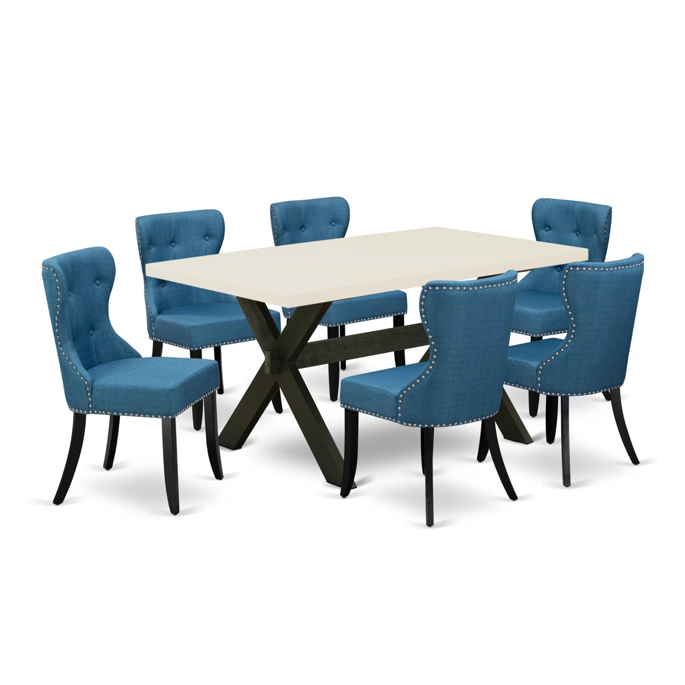 East West Furniture - X626Si121-7 - 7-Pc Modern Dining Table Seta 7-Piece Dining Table Set, Comprising A Table And 6 Exquisite Kitchen Chairs, Can Elevate Your Dining Room'S Aesthetic Appeal. This Dining Set Brings A Modern Touch With Its Uniquely Glossy Finish On The Rectangular Tabletop And Upholstered Parson Chairs. Its Versatile Style Seamlessly Complements Various Home Decors, Ensuring Lasting Allure. This Opulent Dining Set Effortlessly Harmonizes With Any Room'S Decor. It Features A Rectangular Table Top In An Off-White Finish, Supported By Wire Brushed Black Wood Cross Legs. The Dining Chairs Have A Black Finished Frame With Linen Fabric Seats, And Elegantly Adorned Blue Button Tufted Chair Backs. This Appealing Color Combination Complements Any Room Decor. The Parson Chairs Are Designed With Button Tufted Chair Backs And Durable Linen Fabric. The Dining Chair Frame Is Crafted From Long-Lasting Wood. The Asian Wood Frame Of The Dining Table Offers Exceptional Durability, While The Linen Fabric Seat Of The Chairs Requires Minimal Maintenance For Everyday Use. This Distinctive Dining Set'S Timeless Design Suits Various Decor Styles, Ensuring A Comfortable Dining Experience With Its Smooth Linen Fabric Seats.Product Features: Material: Asian Hardwood Seating Material: Linen Fabric Table Top Color: Off-White Table Legs Color: Wire Brushed Black Chairs Legs Color: Black Chairs Fabric Color: Blue Table Dimensions: Length: 60; Width: 36; Height: 30. Chairs Dimensions: Length: 21.5; Width: 19.5; Height: 35.5.Included In The Package: The Awesome Wood Dining Table And 6 Lovely Padded Parson Chair.
