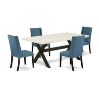 East West Furniture - X627Fl121-5 - 5-Piece Dining Room Setthis 5-Piece Dining Table Set Includes 4 Padded Chairs With A Stylish Chair Back, Blending Modern And Traditional Design. The Dining Table Has A Rectangular Top And Sturdy Hardwood Legs. Our Cushioned Parson Chairs And Kitchen Dining Table Are Highly Versatile, Perfect For Enhancing Any Dining Area Or Kitchen With A Professional And Sophisticated Touch. The Modern Kitchen Table Has An Elegant Off-White Rectangular Tabletop Paired With Wire-Brushed Black Wooden Legs. Dining Chairs Feature Mineral Blue Linen Fabric And Matching Wire-Brushed Black Wooden Legs, Offering Both Style And Comfort. With Comfy Chair Seats And Padded Backs, Our Kitchen Set Ensures A Cozy Dining Experience. Crafted From High-Quality Rubberwood, The Set Combines Style And Durability. Padded Chairs Use Superior Materials For Comfort, And The Solid Wood Structure Can Support Up To 300Lbs. This Set Includes A Chic, Modern Dining Table And Mid-Century Dining Chairs, Perfect For Your Kitchen Or Dining Room. The Rectangular Table Comfortably Seats Multiple People. Dining Room Chairs Have A Robust Asian Wood Frame, Supporting Up To 300Lb, With Easy-To-Maintain Upholstered Linen Fabric Seats. Enhance Your Home Decor With This Stylish Rectangular Dining Table And Kitchen Chairs.Product Features: Chairs Color: Mineral Blue Table Top Color: Off-White Table Base Color: Wire Brushed Black Chairs Legs Color: Wire Brushed Black Table Dimensions: Length: 72; Width: 40; Height: 30. Chairs Dimensions: Length: 25; Width: 19.25; Height: 40.5.Package Includes: 4 Parson Dining Chairs And A Wood Table.