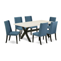East West Furniture X627Fl121-7 7 Piece Kitchen Table Set Consist Of A Rectangle Dining Table With X-Legs And 6 Blue Linen Fabric Parsons Dining Chairs, 40X72 Inch, Multi-Color