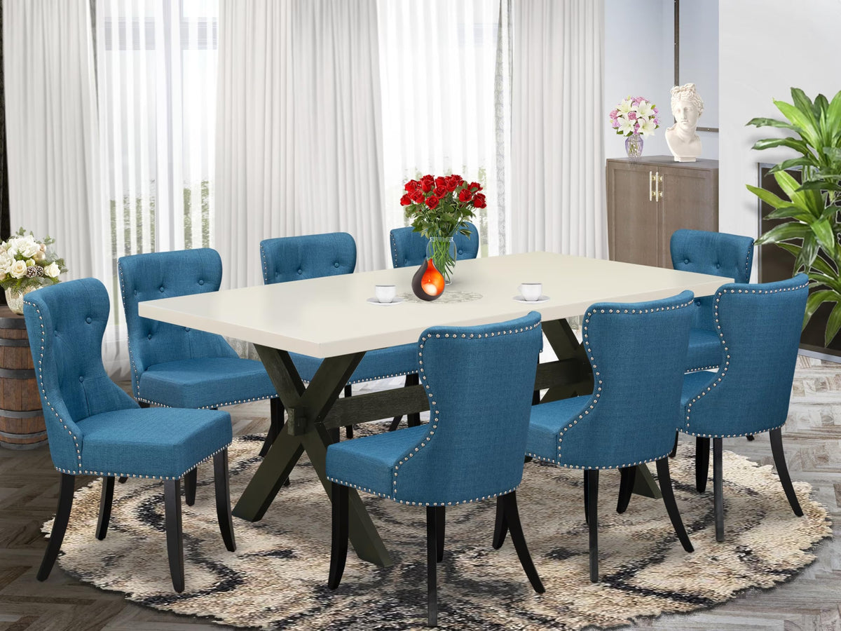 East West Furniture - X627Si121-9 - 9-Pc Dining Room Setelevate Your Dining Space'S Aesthetics With A Wooden Dining Table And 8 Exquisite Padded Parson Chairs. This 9-Piece Kitchen Ensemble Adds A Modern Touch With A Uniquely Appealing Design, Featuring A Rectangular Tabletop And Stylish Mid-Century Dining Chairs With Fabric Seats. Create Cherished Memories With Loved Ones Around This Stunning Kitchen Table Set. Our Modern Dining Set Combines An Off-White Rectangular Table Top With Wire Brushed Black Wooden Cross Legs. The Parson Dining Chairs Feature A Black Frame, Linen Fabric Seats, And A Blue Button Tufted Chair Back, Seamlessly Complementing Any Room Decor. These Parsons Dining Chairs Feature Linen Fabric Seats And A Button Tufted Chair Back, With Frames Crafted From Wood. The Asian Wood Frame Of Our Mid-Century Dining Table Offers Excellent Durability. The Linen Fabric Seat Of The Chairs Is Easy To Maintain, Requiring Minimal Upkeep For Regular Use. This Rectangular Dining Table Boasts An Elegant Design With Its Top And Wooden Cross Legs. The Padded Parson Chairs, With Linen Fabric Seats, Button Tufted Chair Backs, And Durable Frames, Provide A Comfortable And Sophisticated Seating Solution That Harmonizes With A Wide Range Of Interior Decors.Product Features: Material: Asian Hardwood Fabric Material: Linen Fabric Table Top Color: Off-White Table Legs Color: Wire Brushed Black Chairs Legs Color: Black Chairs Fabric Color: Blue Table Dimensions: Length: 72; Width: 40; Height: 30. Chairs Dimensions: Length: 21.5; Width: 19.5; Height: 35.5.Included In The Package: The Dining Table And 8 Dining Room Chairs.