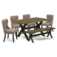 East West Furniture - X676Si648-6 - 6-Pc Dining Room Seta Breakfast Table, An Exquisite Dining Bench, And 4 Dining Chairs Collectively Contribute To The Enhancement Of The Aesthetic Appeal In Your Dining Room. This Thoughtfully Curated 6-Piece Dining Table Set Introduces A Modern Polished Aesthetic, Characterized By Rectangular Tabletops On Both The Dining Bench And Kitchen Table. The Set Exudes Sophistication With Its Distressed Jacobean Rectangular Table Top, Elegantly Complemented By Wire Brushed Black Wooden Cross Legs. The Dining Chairs Are Distinguished By Their Wire Brushed Black Finish Frame And Linen Fabric Seats, Further Elevated By A Coffee Button Tufted Chair Back. The Wooden Bench Top Showcases An Elegant Distressed Jacobean Color, While The Legs Are Impeccably Finished In Wire Brushed Black. These Meticulously Crafted Upholstered Dining Chairs Exhibit Meticulous Attention To Detail, Boasting A Button Tufted Chair Back And Adorned With Linen Fabric Upholstery. The Dining Chairs Are Constructed With Robust Wooden Frames Crafted From High-Quality Asian Wood, Ensuring Exceptional Durability. Both Our Dining Table And Dining Bench Feature Rectangular Tops And Wooden Cross Legs. These Parson Dining Room Chairs Prioritize Comfort, Thanks To Their Coffee Linen Fabric Seats, Button Tufted Chair Backs, And Sturdy Frames.Product Features: Material: Asian Hardwood Seating Material: Linen Fabric Table And Bench Top Color: Distressed Jacobean Table And Table Bench Legs Color: Wire Brushed Black Chairs Legs Color: Wire Brushed Black Chairs Fabric Color: Coffee Table Dimensions: Length: 60; Width: 36; Height: 30. Chairs Dimensions: Length: 21.5; Width: 19.5; Height: 35.5. Bench Dimensions: Length: 60; Width: 15; Height: 18.Included In The Package: A Dining Table, A Bench And 4 Parson Chairs.