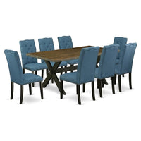 East West Furniture - X677El121-9 - 9-Piece Dining Setour Distinguished 9-Piece Set Comprises 8 Padded Chairs, Tastefully Adorned With Button Tufted Chair Backs, Representing A Seamless Fusion Of Modern Design And Traditional Elegance. The Rectangular Dining Table Features A Well-Proportioned Top And Sturdy Solid Wood Legs, Exuding An Air Of Refinement In Your Dining Area. These Upholstered Dining Chairs And The Accompanying Dining Table Are Versatile Pieces That Effortlessly Harmonize With Diverse Decor Themes. Our Exceptional Dining Table Showcases A Distressed Jacobean Rectangular Tabletop Impeccably Paired With Wire Brushed Black Wooden Legs. The Parsons Dining Room Chairs Are Enriched With Mineral Blue Linen Fabric Upholstery And Wire Brushed Black Wooden Legs, Striking A Perfect Balance Between Comfort And Style. The Kitchen Table Set Ensures A Comfortable Dining Experience With Its Cushioned Chair Seats And Padded Backrest. Crafted From High-Quality Asian Wood, Particularly Renowned As Rubberwood, This Rectangular Table And Its Accompanying Modern Dining Chairs Exemplify Exceptional Craftsmanship. The Solid Wood Leg Chairs Are Constructed With Top-Tier Materials, Featuring A Solid Wood Structure With An Impressive Weight Capacity Of 300Lb. The Asian Wood Framework Of Our Dining Chairs Provides Robust Support, Accommodating Up To 300Lb, While The Easily Maintained Upholstered Linen Fabric Seats Are Perfect For Everyday Use.Product Features: Color Of Modern Dining Chairs Seat: Mineral Blue Color Of Kitchen Table Top: Distressed Jacobean Color Of Kitchen Table Base: Wire Brushed Black Parson Chairs Legs Color: Wire Brushed Black Dining Table Dimensions: Length: 72; Width: 40; Height: 30 Dining Chairs Dimensions: Length: 24.5; Width: 19; Height: 40.5.Package Includes: 8 Dining Chairs And A Rectangular Table.