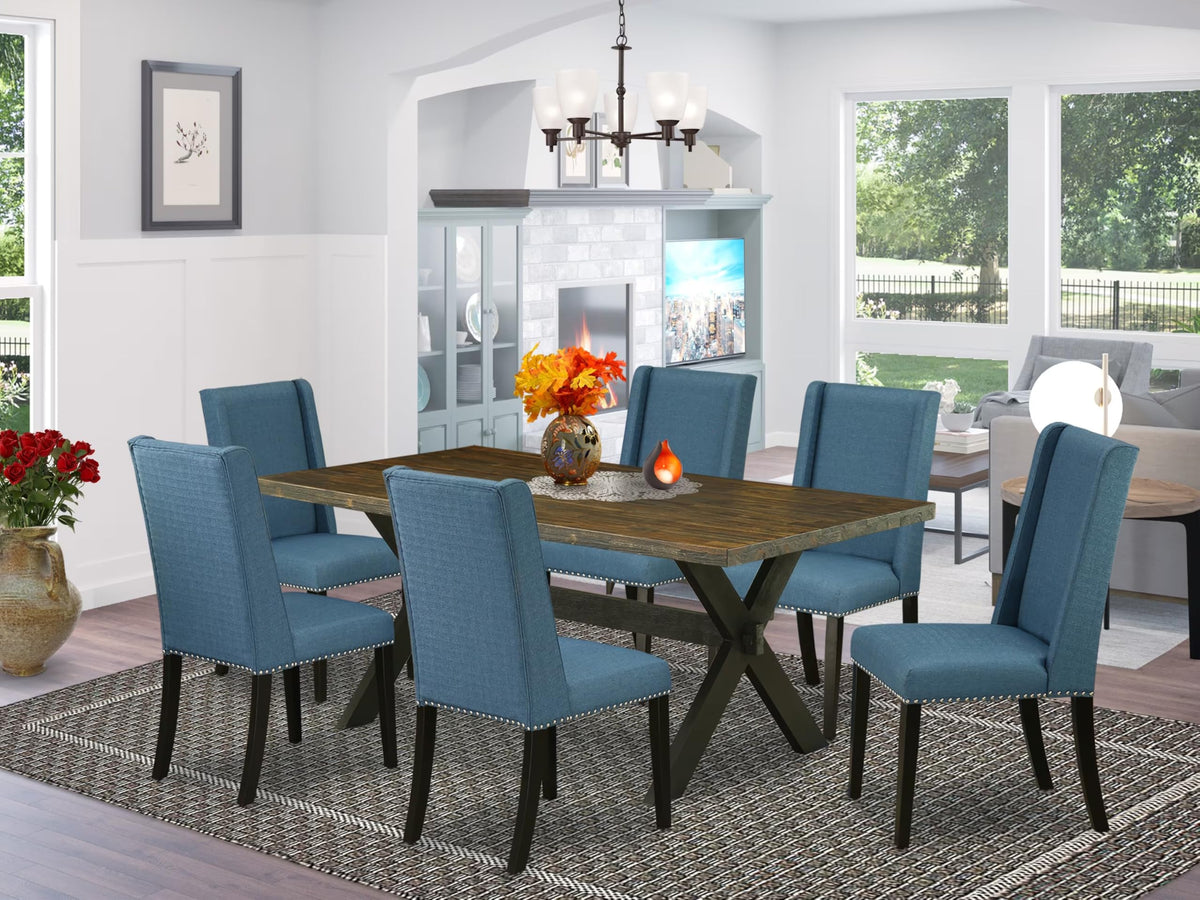 East West Furniture X677Fl121-7 7 Piece Kitchen Table Set Consist Of A Rectangle Dining Table With X-Legs And 6 Blue Linen Fabric Parsons Dining Chairs, 40X72 Inch, Multi-Color