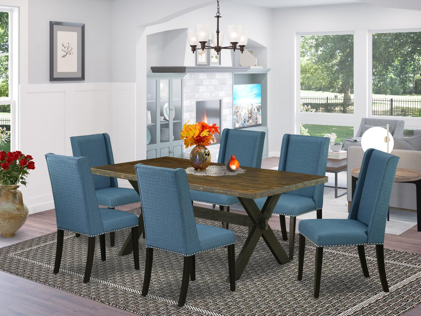 East West Furniture - X677Fl121-7 - 7-Piece Rectangular Dining Room Table Setour Magnificent 7-Piece Set, Comprising 6 Padded Chairs Adorned With A Stylish Chair Back, Exemplifies The Perfect Fusion Of Innovative Design And Timeless Style And A Modern Rectangular Dining Table That Features A Hardwood Top And Sturdy Legs, Creating An Elegant Juxtaposition Of Form And Function. This Ensemble, Showcasing The Dining Chairs And The Modern Rectangular Dining Table, Seamlessly Harmonizes With A Variety Of Decor Themes. The Exceptional Modern Kitchen Table Boasts A Distressed Jacobean Rectangular Tabletop Complemented By Wire Brushed Black Wooden Legs. The Parson Chairs, Elegantly Upholstered In Mineral Blue Linen Fabric And Supported By Four Wire Brushed Black Wooden Legs, Strike A Perfect Balance Between Aesthetics And Comfort. The Chair Seats And Padded Backrests Enhance The Overall Comfort Of Our Kitchen Dining Room Set. Our Modern Dining Table And Parson Dining Chairs Are Meticulously Crafted From High-Quality Asian Wood, Precisely Identified As Rubberwood. The Kitchen Chairs Are Expertly Fashioned With Top-Tier Materials, Featuring A Solid Wood Structure Boasting An Impressive Weight Capacity Of 300Lb. This 7-Piece Dining Room Table Set Comprises An Elegant Kitchen Dining Table Matched With High-Quality Upholstered Dining Chairs. The Parson Dining Chairs Are Characterized By Their Robust Asian Wood Frames.Features: Color Of Dining Room Chairs Seat: Mineral Blue Color Of Dining Table Top: Distressed Jacobean Color Of Dining Table Base: Wire-Brushed Black Dining Chairs Legs Color: Wire Brushed Black Rectangular Dining Table Dimensions: Length: 72; Width: 40; Height: 30. Kitchen Chairs Dimensions: Length: 25; Width: 19.25; Height: 40.5.Package Includes: 6 Parson Chairs And A Rectangular Dining Table.
