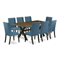 East West Furniture X677Fl121-9 9 Piece Dining Room Furniture Set Includes A Rectangle Dining Table With X-Legs And 8 Blue Linen Fabric Upholstered Chairs, 40X72 Inch, Multi-Color