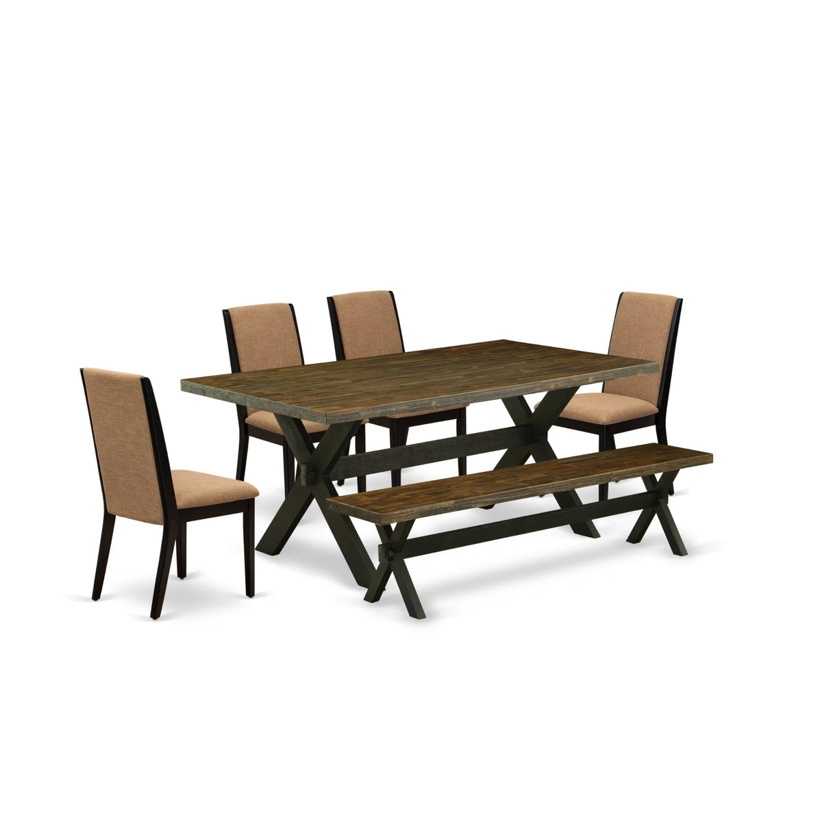East West Furniture - X677La147-6 - 6-Pc Rectangular Dining Room Table Setwe Are Pleased To Introduce Our 6-Piece Dining Table Set, Which Represents A Harmonious Fusion Of Modern And Traditional Design Elements. This Comprehensive Collection Includes Four Padded Chairs, Each Featuring An Elegant Chair Back, A Rectangular Table, And A Hardwood Bench. The Ensemble Emanates An Aura Of Sophistication And Versatility, Making It A Well-Suited Addition To Both Your Dining Room And Kitchen, Effortlessly Harmonizing With A Variety Of Decor Themes. The Centerpiece Of This Dining Set Is The Distinguished Rectangular Table, Distinguished By Its Refined Finish. It Boasts A Distressed Jacobean Rectangular Tabletop, Elegantly Supported By Wire Brushed Black Wooden Legs. The Padded Parson Chairs Are Tastefully Upholstered In Light Sable Linen Fabric, Complemented By Four Meticulously Crafted Wire Brushed Black Wooden Legs, Ensuring A Comfortable And Refined Dining Experience. Crafted From Premium Asian Wood, Precisely Identified As Rubberwood, Our Dining Table, Bench, And Padded Chairs Exemplify Meticulous Craftsmanship. The Modern Dining Chairs, In Particular, Are Constructed With Top-Tier Materials, Featuring A Solid Wood Structure With An Impressive Weight Capacity Of 300 Pounds, Guaranteeing Durability And Reliability.Product Features: Color Of Chairs: Light Sable Color Of Table Top: Distressed Jacobean Color Of Table Base: Wire Brushed Black Color Of Bench Top: Distressed Jacobean Color Of Bench Base: Wire Brushed Black Table Dimensions: Length: 72; Width: 40; Height: 30. Chairs Dimensions: Length: 22; Width: 20; Height: 39. Bench Dimensions: Length: 72; Width: 15; Height: 18.Package Include: 4 Upholstered Dining Chairs And A Kitchen Rectangular Table And A Kitchen Bench