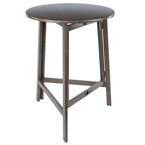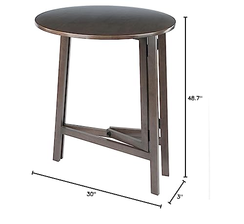 Introducing the Ergode Wood Torrence High Table, a folding round table that instantly provides extra tabletop space. Its unique triangular frame design adds a contemporary touch to any room. When not in use, the table conveniently folds to a slim 3" depth for easy storage. With a diameter of 30", this sturdy solid wood table in oyster gray finish offers ample space for meals or snacks. It's perfect for smaller dining spaces, craft rooms, and even dorms or studio apartments. The table comes with crossbars for added stability and a metal catch to lock the frame in place. You can also create a cohesive dining set by pairing it with stools from the Ergode Wood collections (sold separately). The table is shipped in one box with all the necessary hardware for assembly. If you need any replacement parts, you can contact the manufacturer within 60 days of purchase. The overall dimensions of the table are 30" diameter x 40"H when open and 30"W x 3"D x 48.7"H when folded. The clearance of the larger leg from the bottom crossbar to the apron is 19.4"-23.7"W x 27.5"H, while the clearance of the smaller leg is 17"-20.4"W x 23.7"H. The bottom crossbars are 8.1"-10"H from the ground. Assembly is required. The table weighs 30.86 lbs and measures 30.83" W x 32.36" D x 40" H.