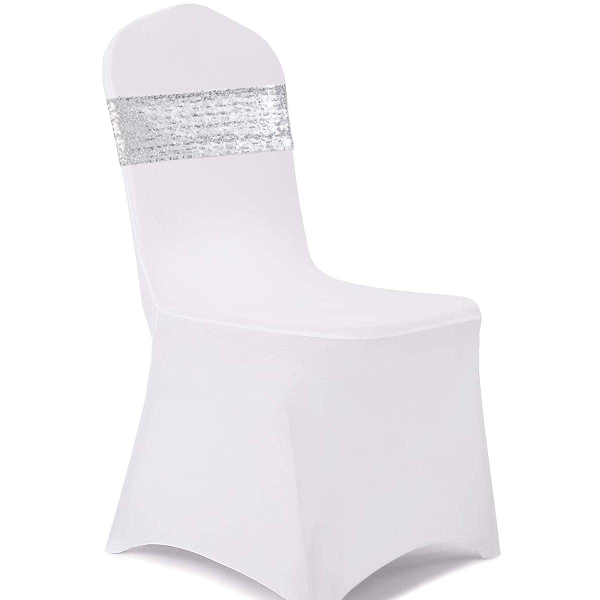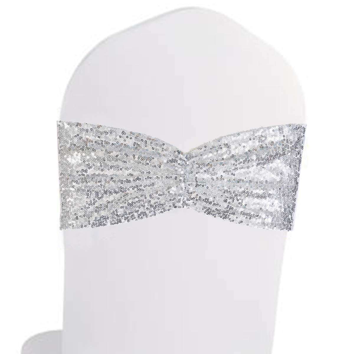 Both Side Is Made Of Sequin Fabric. One Side Is Made Into The Bow-Knot Shape. | Strech Sequin Fabric Design, Super Easy To Use. Well Hemmed Edges Make It Durable. | Shiny Glitter Look Will Add An Elegant And Festive Accent To Your Banquet White Chair. They Can Get Your Chairs Out Of Dullness. | These Chair Sashes Are Widely Used In Wedding, Baby Shower, Birthday Party Ceremony Reception Graduation Holidays Events. They Are Great Glitter Decorations For Your Events. | Normal Size: 5.7X13.4 Inches, Suitable For Width Of Chairs: 11.8 - 19.7 Inch. Package Include 10Pcs Chair Sashes.