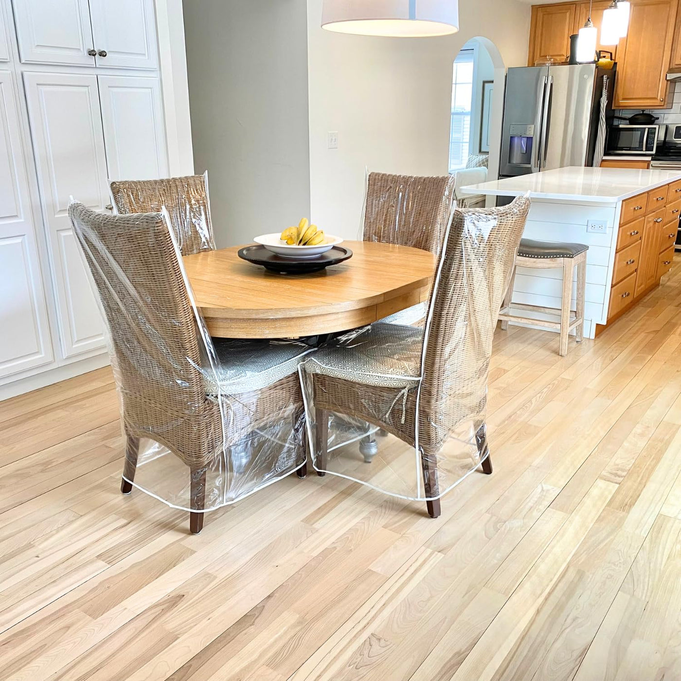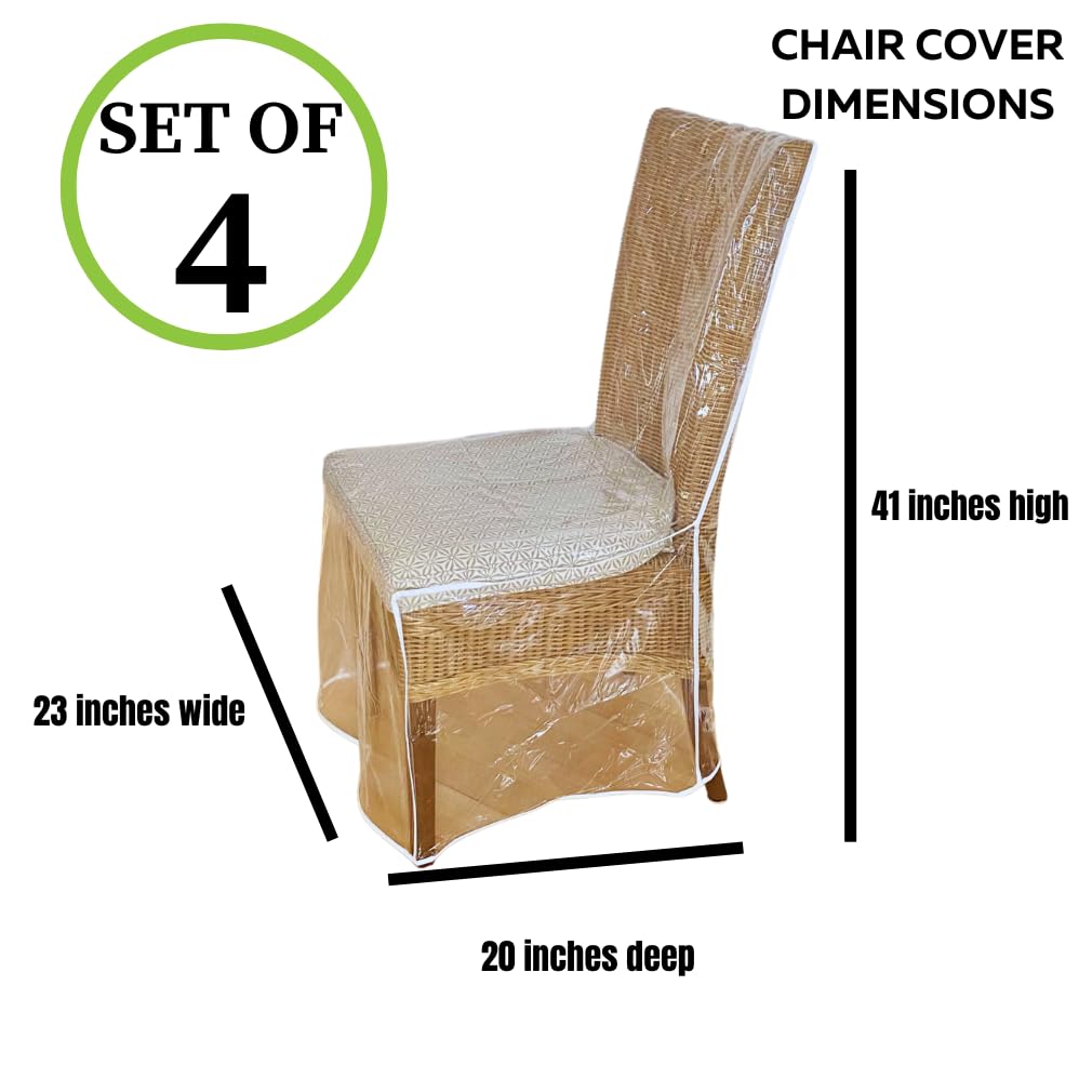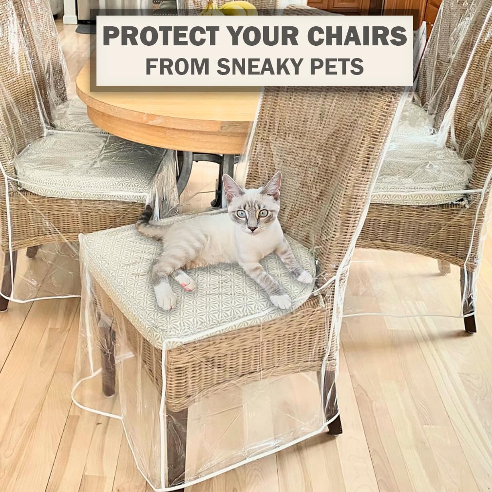 Clear plastic protects from damage such as spills, dust, cat fur, pet claw damage. Also, ideal for protecting chairs from children's messes. Chair protectors are constructed of easy to clean PVC plastic, simply wipe with a damp cloth and then let air dry before using or storing. PVC is seamed in white. Please make sure to measure your chair first before purchasing. Easy to clean. Spill resistant chair protectors. Note this design does not work with dining chairs with arms. Measures approximately 23 Inches Long x 20 Inches Wide x 41 Inches High, PVC is approximately .05 MM thick. Accommodates chairs with seat backs up to 25 Inches.