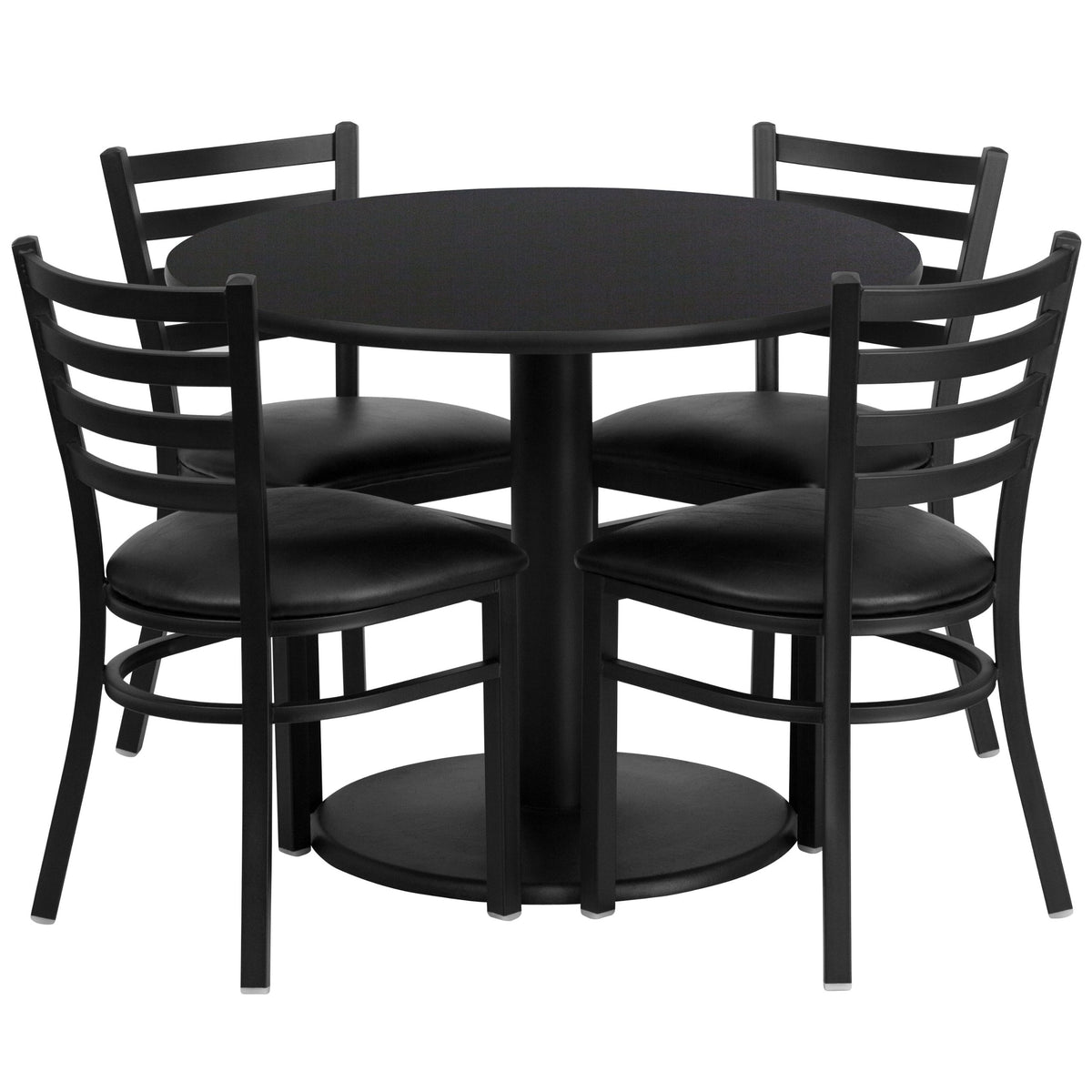 Don't have time to search through hundreds or thousands of table and seating options? This complete Banquet Table and Chair set saves you time to focus on your growing business.This set includes an elegant Black Laminate Table Top, Round Base and 4 Metal Ladder Back Chairs. Surface is heat, scratch and moisture resistant. Easily clean using a mild detergent and water, dry clean to keep your tables spotless. Use this setup in banquet halls, wedding ceremonies, hotel conferences, restaurants, break room/cafeteria settings or any other social gathering. The lightweight designer metal chair will enhance any environment.Whether you are just starting your business or upgrading your home or business furniture this restaurant quality table set will round out your dining space.