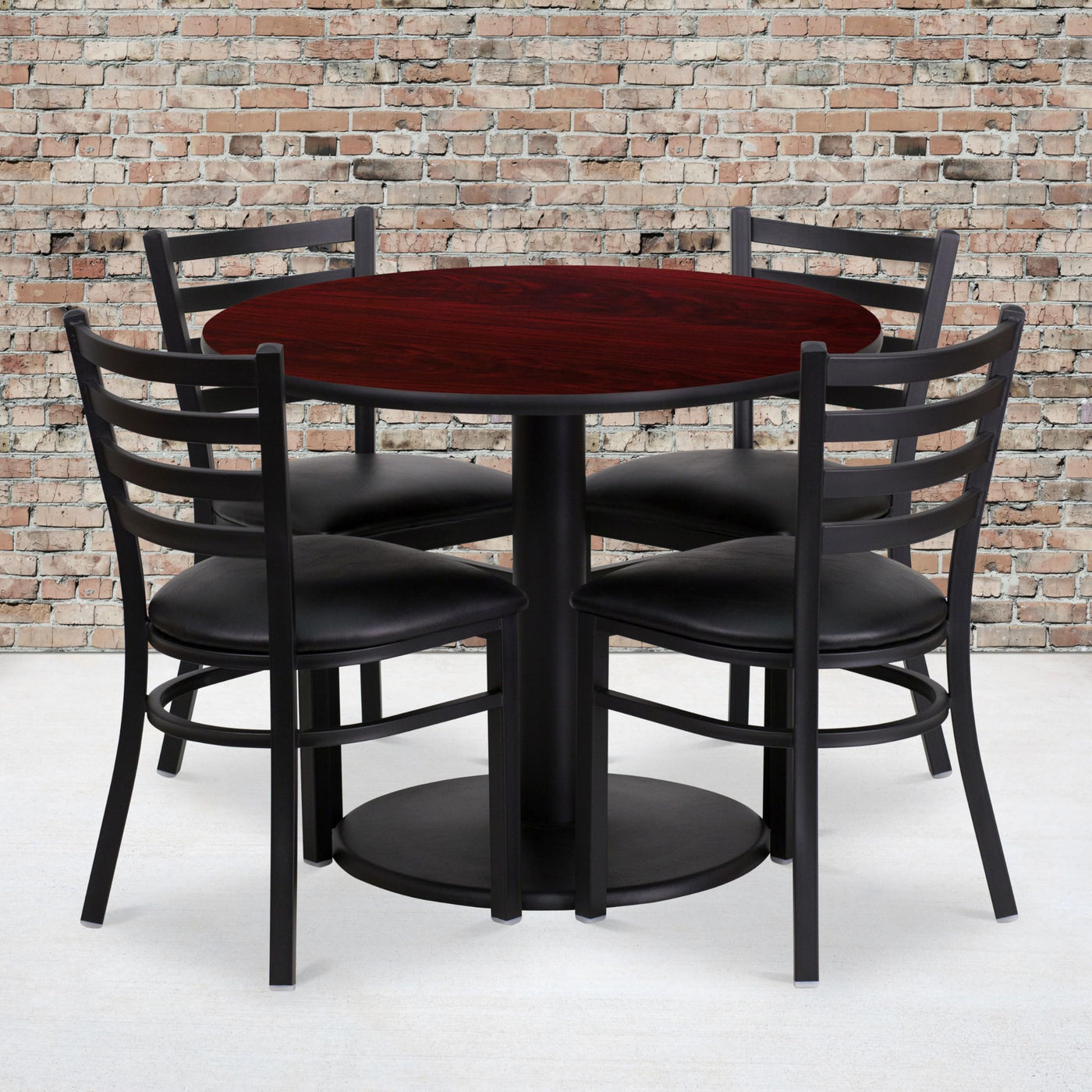 Flash Furniture 36'' Round Mahogany Laminate Table Set With Round Base And 4 Ladder Back Metal Chairs - Black Vinyl Seat