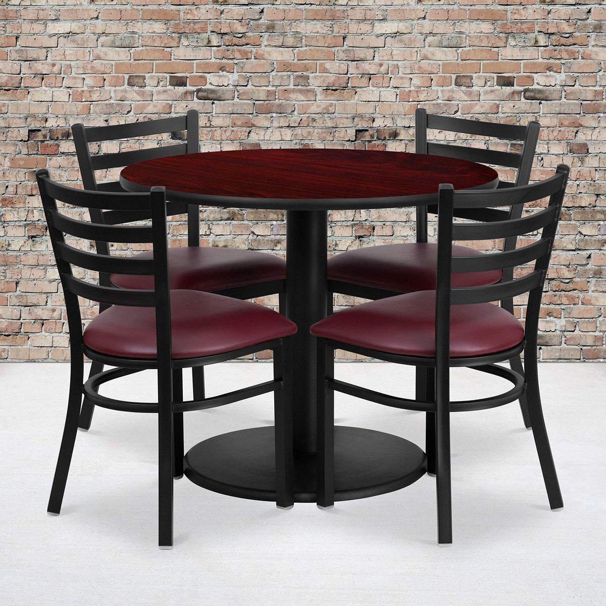 Flash Furniture 36'' Round Mahogany Laminate Table Set With Round Base And 4 Ladder Back Metal Chairs - Burgundy Vinyl Seat