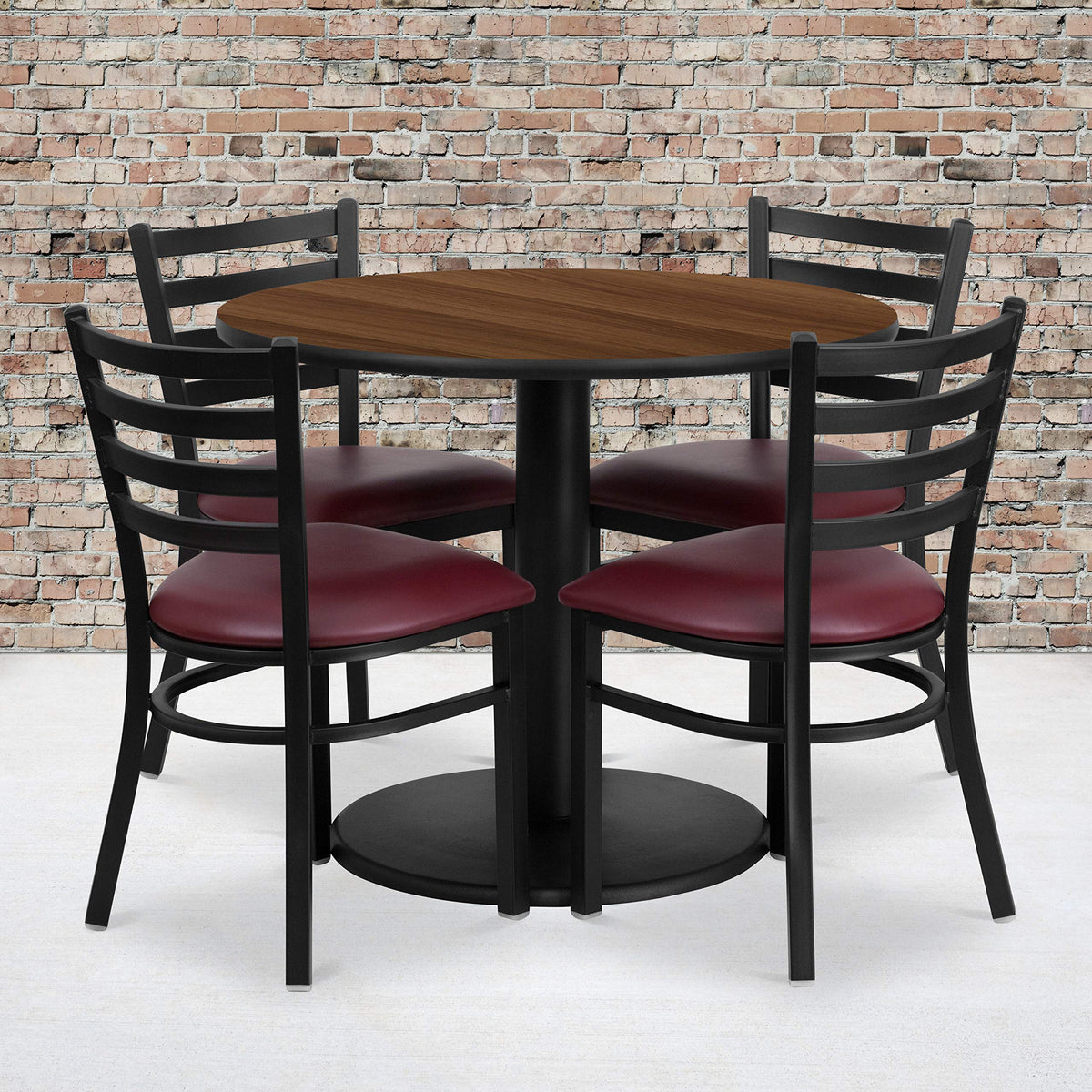 Flash Furniture 36'' Round Walnut Laminate Table Set With Round Base And 4 Ladder Back Metal Chairs - Burgundy Vinyl Seat