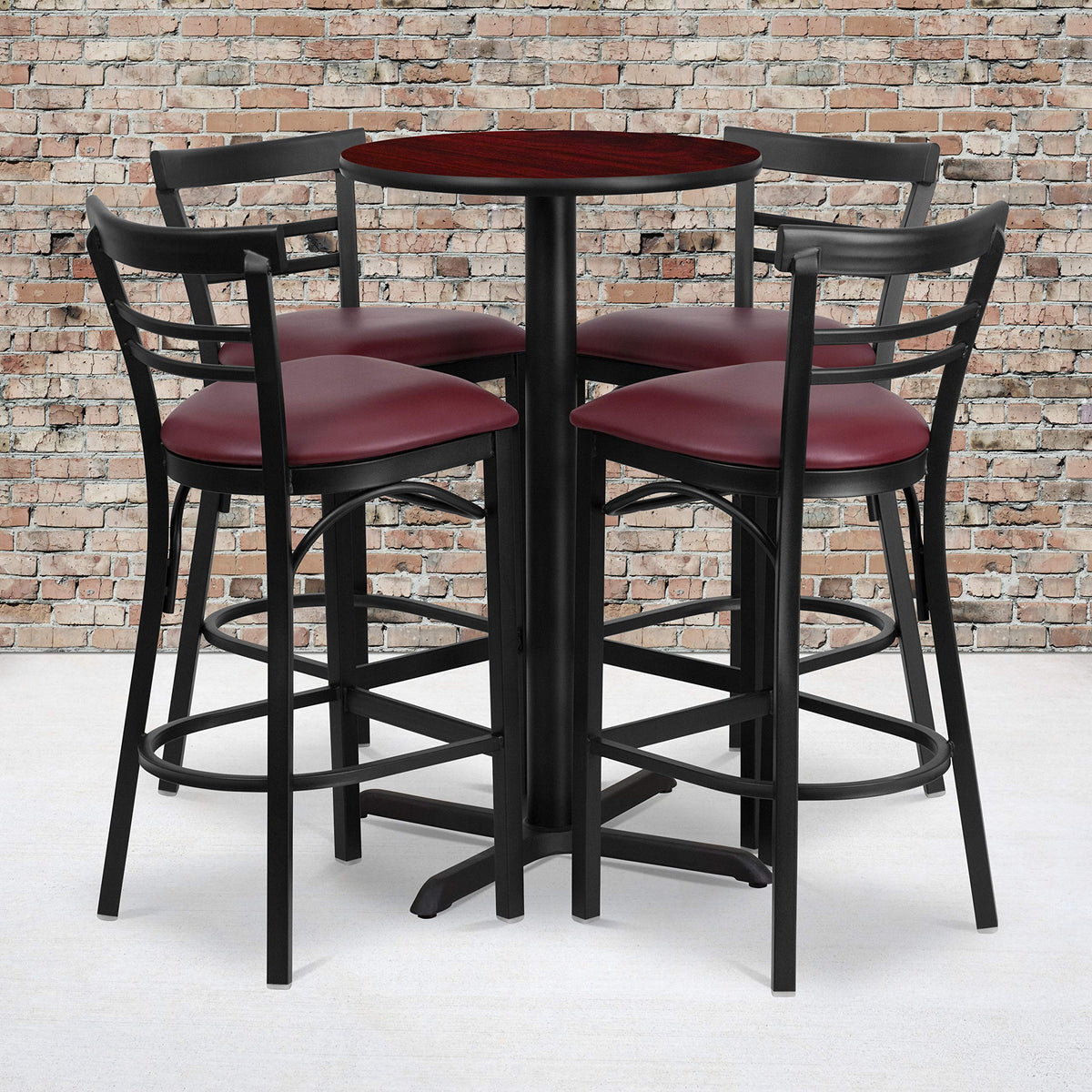 Flash Furniture Carlton 24'' Round Mahogany Laminate Table Set With X-Base And 4 Two-Slat Ladder Back Metal Barstools - Burgundy Vinyl Seat
