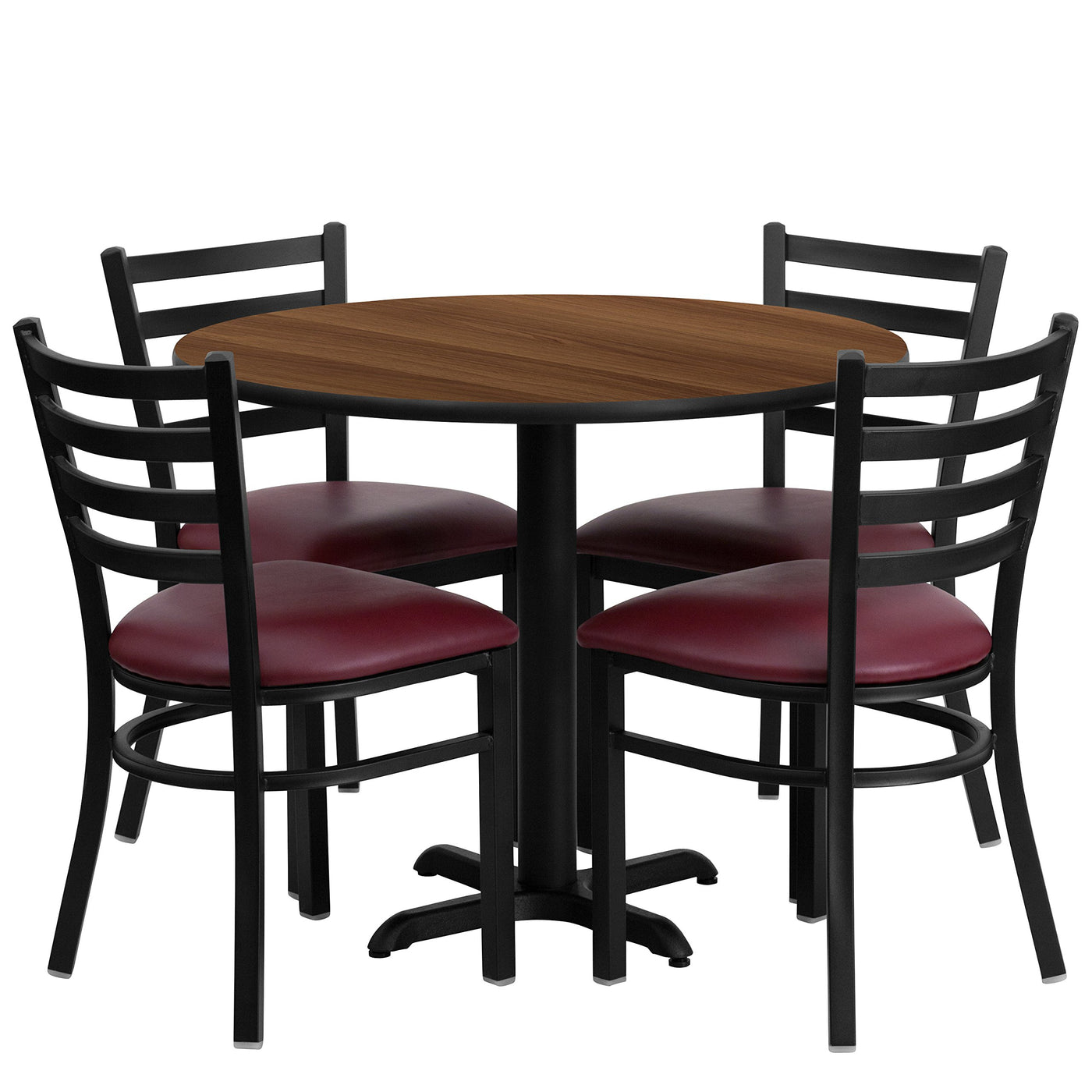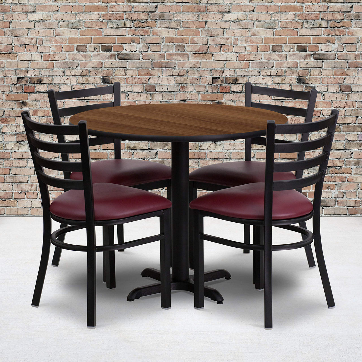 Flash Furniture Carlton 36'' Round Walnut Laminate Table Set With X-Base And 4 Ladder Back Metal Chairs - Burgundy Vinyl Seat