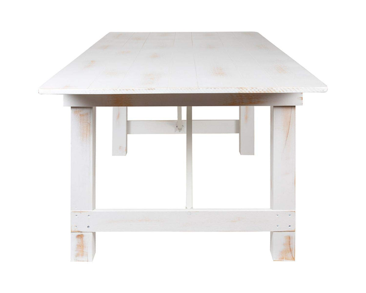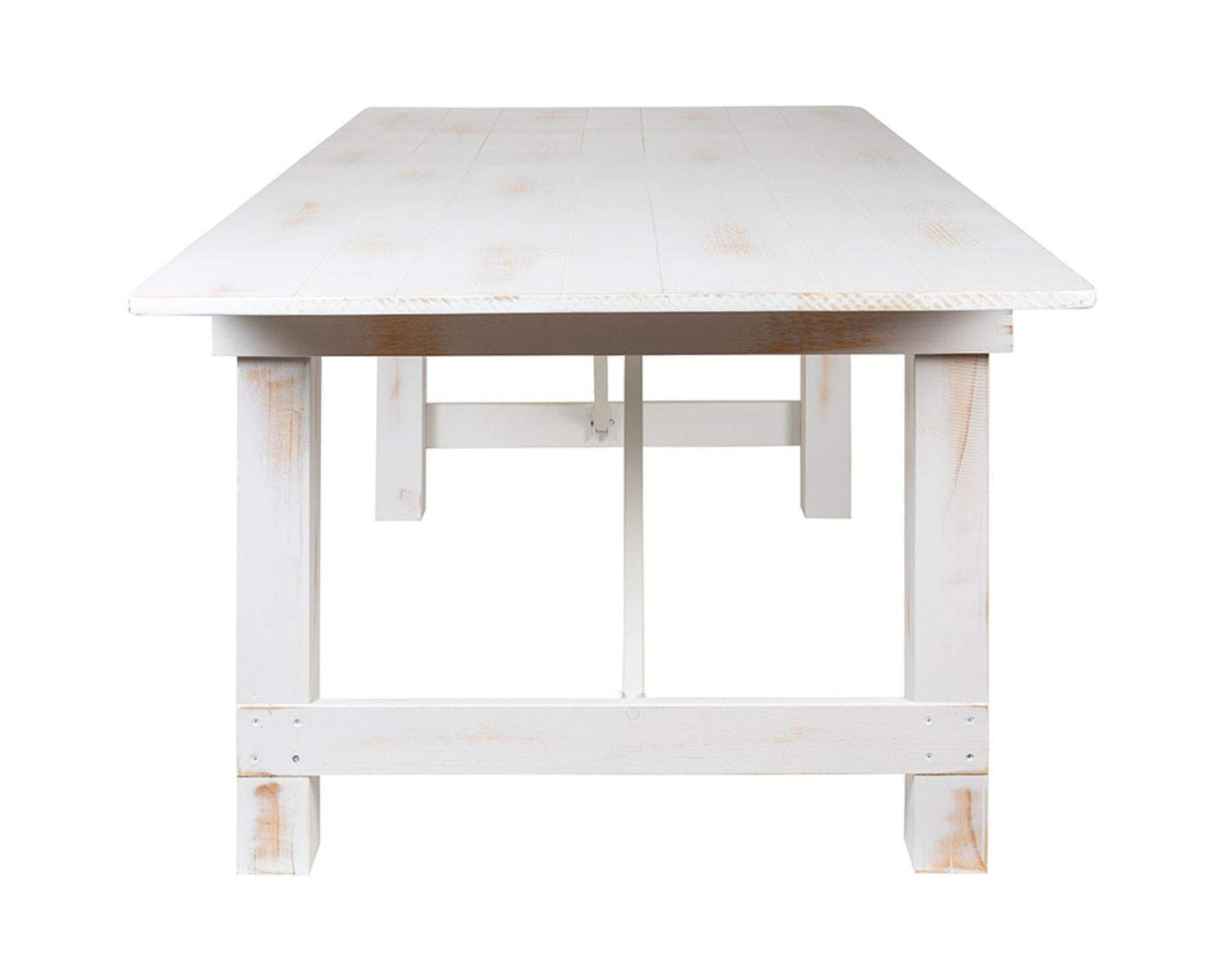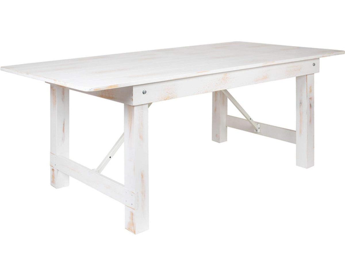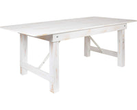 Set a stylish and rustic anchor in the heart of your home with this white rectangle dining room table where family can come together for delicious food and great conversation. Accommodate visiting guests with this extra-large rustic dining table that can comfortably seat up to eight people. Pins provide extra stability while in use, pull out the pins to fold the legs for transport. With its solid pine construction our beautiful farm table is suitable for daily use in restaurant and hospitality industries. To keep in spotless condition, use a water based cleaner and follow-up with a dry cloth. While constructed for indoor use, our transportable dining room table can be taken outdoors for special events like family get-togethers and backyard barbecues during good weather. Achieve country-rustic appeal by leaving the table as-is, or easily dress it up with a tablecloth for elegant events.