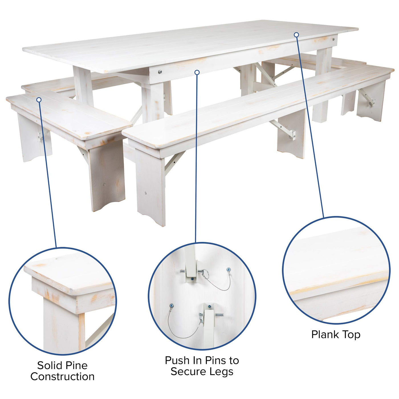 Invite family and friends over to dine in style on your modern farmhouse dining set. This rustic dining table will bring warmth to your kitchen or dining room. The robust design is suitable for the restaurant and hospitality industry. A simple, rustic design and color accentuate this beautiful farm table. The plank dining table is made of solid pinewood and is supported by a thick apron. Both table and benches have folding legs to transport outdoors or to different event locations. Pins pull out to fold the legs that securely lock underneath the tops. The same pins provide extra stability when the table and seats are in use. Bench seating offers a comfortable way for people to sit together in an open design, for home and businesses alike having the sightlines free of chair backs. Although constructed for indoor use, you may enjoy outdoors for special events during good weather. Use a water based cleaner and dry clean to keep your tables spotless. If you're going for a country modern appeal, the 8' x 40' Antique Rustic White Folding Farm Table and Four Bench Set will get you the desired results.