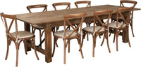 Invite family and friends out to dine in style on your brand new farm house style table set. This rustic style table will bring warmth to your kitchen or dining room. The robust design is suitable for the restaurant and hospitality industry. A simple, rustic design and color accentuate this beautiful farm table. This solid table features a plank, solid pine top with a wide apron. This table has folding legs to transport to different venues or when you move. Pins pull out to fold the legs that securely lock underneath the table. The same pins provide extra stability when the table is in use. The stackable cross back chairs features ash wood, 1" thick natural cushion, and protective floor glides. Although constructed for indoor use, you may enjoy outdoors for special events during good weather. Use a water based cleaner and dry clean to keep your tables spotless. If you're going for a country modern appeal, the 9' x 40'' Antique Rustic Folding Farm Table Set with 8 Cross Back Chairs and Cushions will get you the desired results.