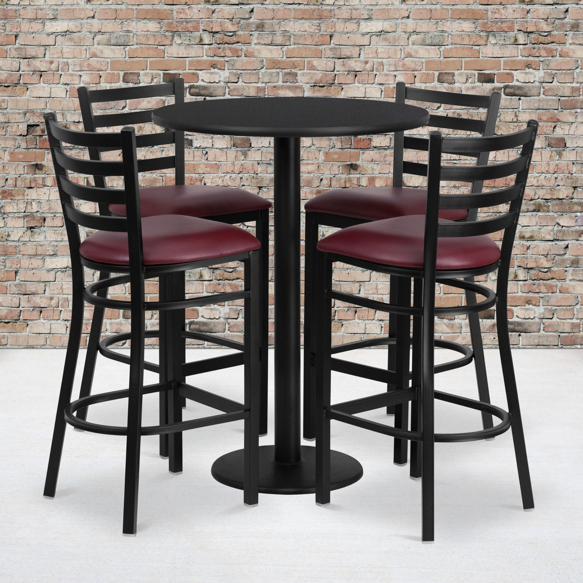 Don'T Have Time To Search Through Hundreds Or Thousands Of Table And Seating Options? This Complete Bar Height Table And Stool Set Saves You Time To Focus On Your Growing Business. This Set Includes An Elegant Black Laminate Table Top, Round Base And 4 Metal Ladder Back Barstools. Surface Is Heat, Scratch And Moisture Resistant. Easily Clean Using A Mild Detergent And Water, Dry Clean To Keep Your Tables Spotless. Use This Setup In Sports Bars, Banquet Halls, Restaurants, Break Room/Cafeteria Settings Or Any Other Social Gathering. Mix In Bar Height Tables With Standard Height Tables For A More Varied Seating Selection. Whether You Are Just Starting Your Business Or Upgrading Your Home Or Business Furniture This Restaurant Quality Bar Table Set Will Round Out Your Dining Space.