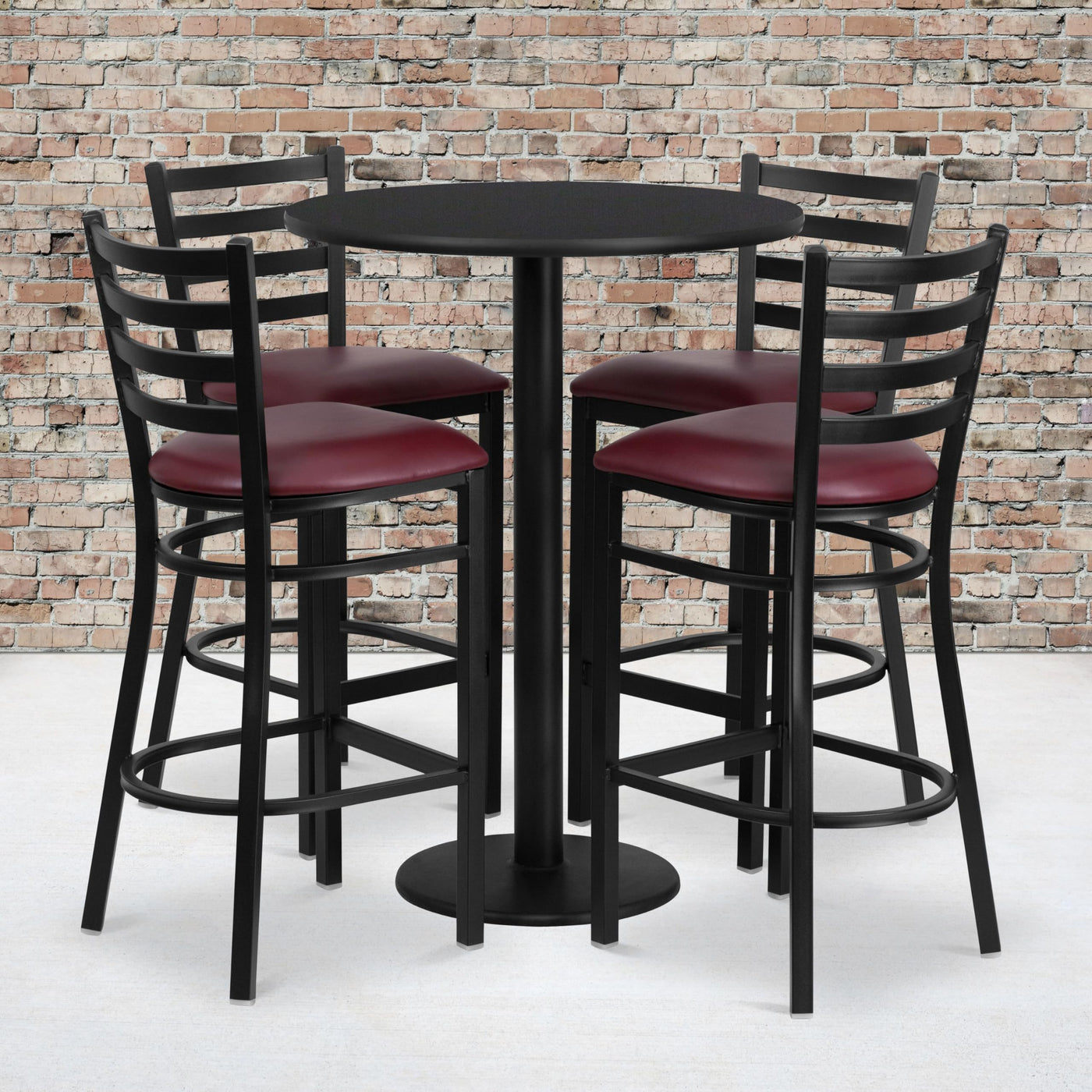 Flash Furniture Jamie 30'' Round Black Laminate Table Set With Round Base And 4 Ladder Back Metal Barstools - Burgundy Vinyl Seat