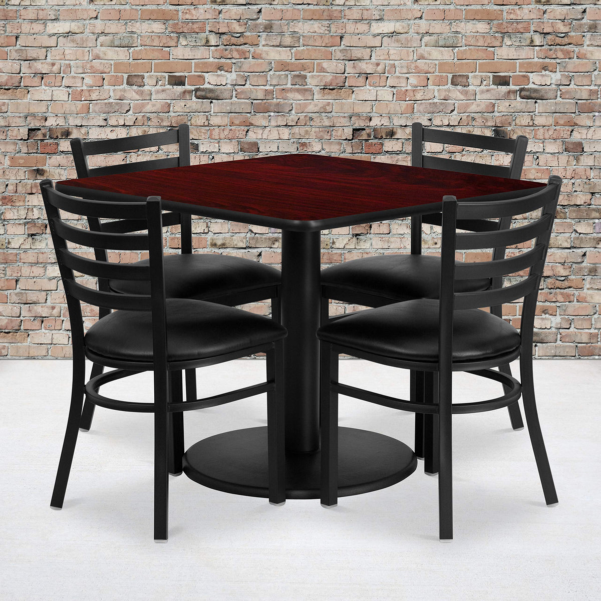 Flash Furniture Jamie 36'' Square Mahogany Laminate Table Set With Round Base And 4 Ladder Back Metal Chairs - Black Vinyl Seat
