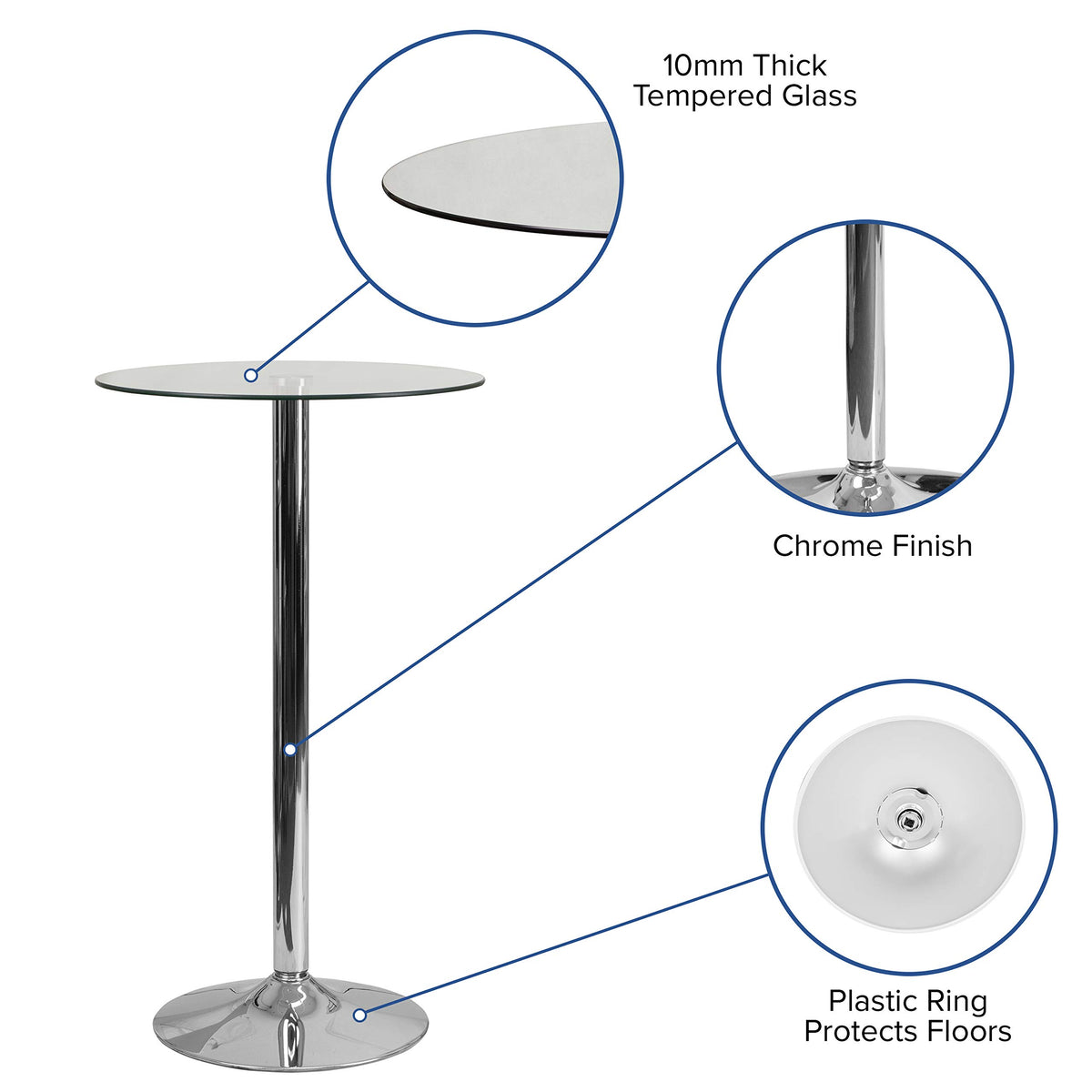 Whether you're hosting the holidays or need additional table space at your venue, this bar height, round glass table can add a timeless elegance to your design. This table can be used for seating placement, cocktail hour or for decorative purposes. The table has a narrow design so there is plenty of room for larger tables to be set up. The round, chrome base is out of the way when guests are socializing and adds a contemporary chic design. The base is fitted with a protective plastic ring, made to prevent your floor from being scratched. This table can be used as a standalone option or with the use of similarly designed adjustable height barstools.