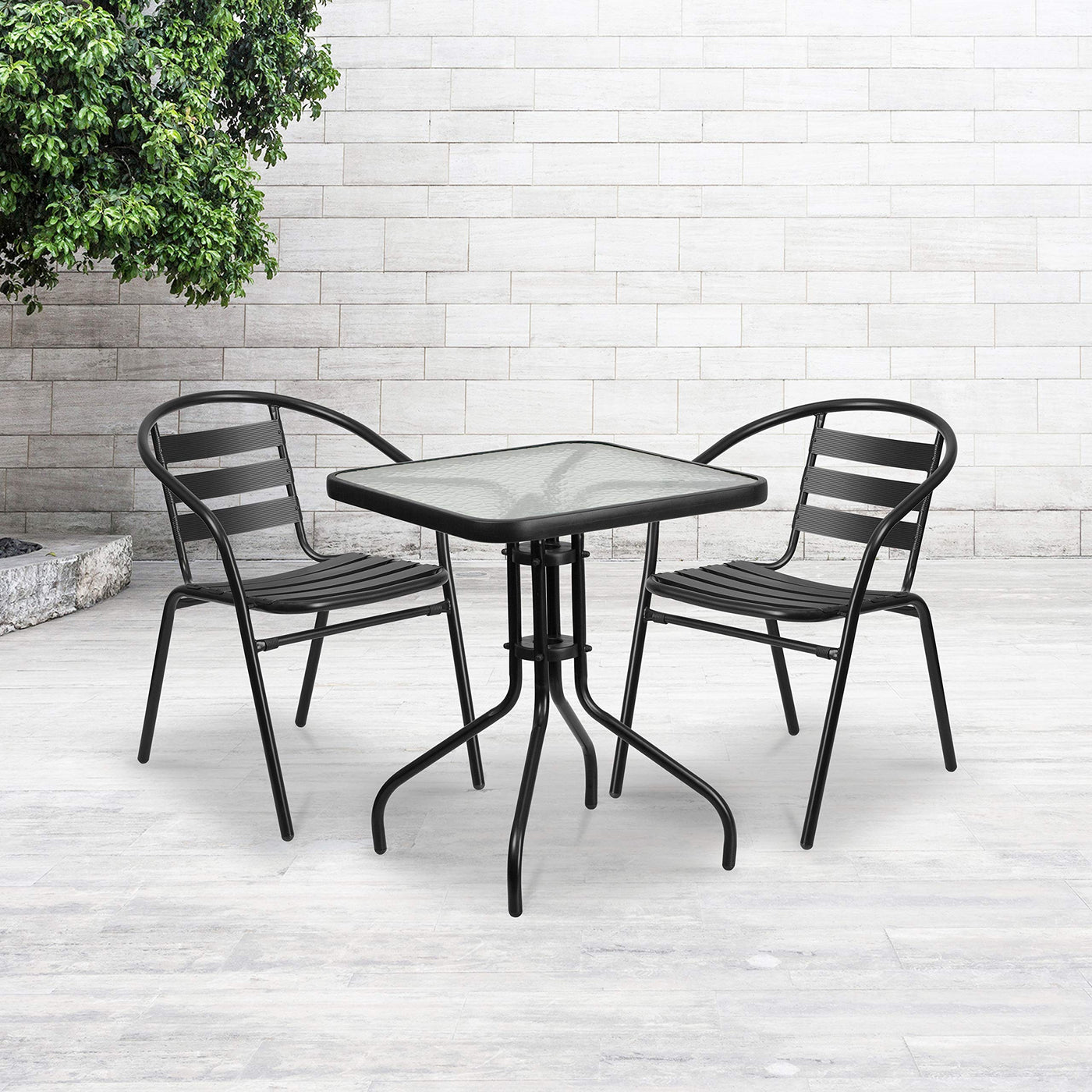 Flash Furniture Lila 23.5'' Square Glass Metal Table With 2 Black Metal Aluminum Slat Stack Chairs