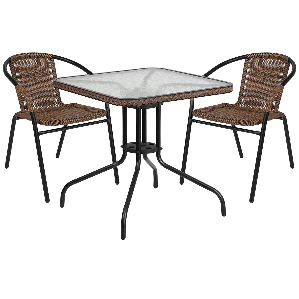 Flash Furniture Lila 3-Piece 28" Square Indoor/Outdoor Patio Table And Chairs Set, Glass Metal Bistro Table And 2 Stacking Rattan Chairs, Brown