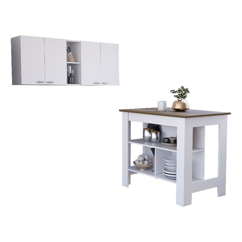 Looking for a kitchen set that will make your kitchen the envy of all your friends and family? Here's the Austin Kitchen Set! This stylish set is designed with an exclusive white-walnut manufactured wood finish, making it a truly unique addition to any home. This set is ideal for anyone who loves to entertain or wants to make a statement in their kitchen. Whether you're looking for a place to enjoy a meal with your family or want to host an intimate gathering, this set will give you everything you need and more. Don't miss out on this must-have kitchen set! This stylish island is perfect for any kitchen, with a large top surface (40,5 'W X 27,5 'D) perfect for meal prep or entertaining. The white-walnut finish is easy to care for and will make your kitchen look its best. The modern style impresses your guests, and the three spacious lower shelves provide plenty of storage space. The Winslow 150' Wall Cabinet is simply exquisite. It's practical, fits easily on any wall, and is easy to assemble. It features two double-door cabinets - one with an internal shelf and the other including two excellent racks, ideal for your dishes or glasses. And in the middle of the cabinet is an open shelf that adds a unique touch (8,81'W X 10,90'H). Such a perfect way to add organization and elegance to your home. Dimensions: Furniture 1, Brooklyn Kitchen Island Width: 40,5” Height: 35,4” Depth: 27,5” Furniture 2, Winslow 150' Wall Cabinet Width: 59,05” Height: 23,62” Depth: 14,40” Furniture Type: Ready to assemble (full assembly required). Certifications: CARB phase II compliant – TSCA Title VI Compliant. Warranty: 1-year warranty coverage in wooden parts- 1-year warranty coverage in hardware pieces since its manufacturing date is found in the lot number printed in the product box.