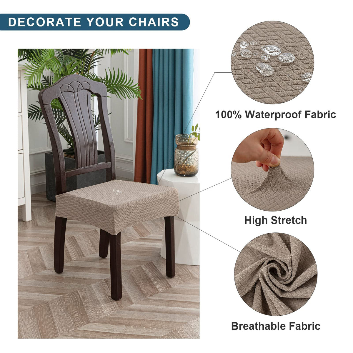 Q: Are the Genina chair covers waterproof and breathable?A: Yes, the Genina chair covers are made from 100% waterproof fabric, effectively protecting your chairs from spills like water, wine, and milk. Additionally, they are breathable, ensuring comfort even during long sitting periods.