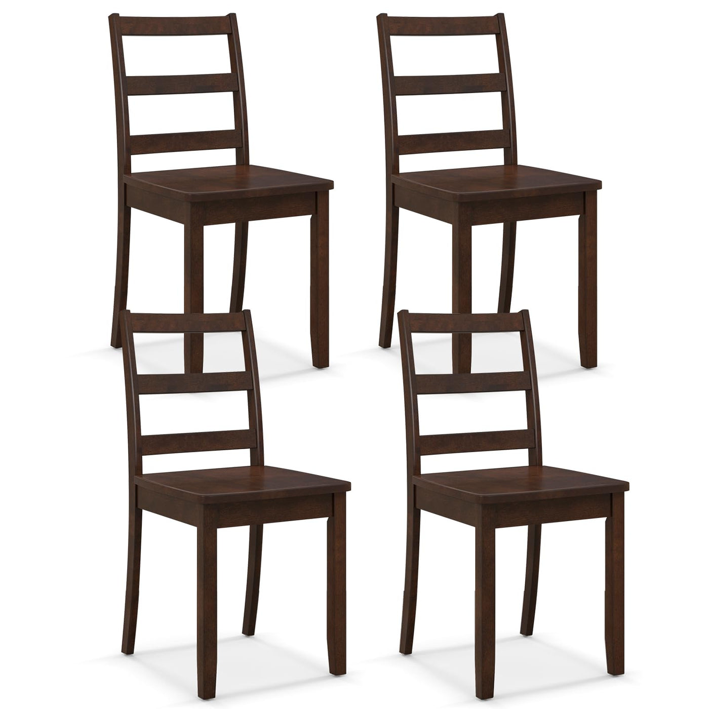 Description: Enjoy A Delicious Dinner With Our Dining Chairs Set! The Solid Rubber Wood Legs Offer Sturdy Support So That Each Chair Holds Up To 400 Lbs. Besides, The Rounded Edges And Burr Free Surface Ensures A Cozy Using Experience. And The Ladder Back As Well As The Smooth Seat Render You Comfortable While Sitting On The Dining Chair. Additionally, The Equipped Non-Slip Foot Pads Prevent The Floor From Being Scratched. Installation Is Just A Breeze With Clear Instruction. Furthermore, The Waterproof Surface Allows Easy Maintenance. Features: Solid Rubber Wood Legs For Overall Steadiness Each Chair Can Support Up To 400 Lbs Ladder Back And Large Seat For Comfortable Use Anti-Slip Foot Pads For Floor Protection Modern And Minimalist Style Combines Function With Aesthetics Widely Applied In The Dining Room, Living Room, Restaurant, Etc Simple Installation Required Easy To Clean With Soft Rags Specifications: Color: Walnut Material: Rubber Wood, Mdf, Plywood Overall Dimension: 16' X 16' X 33.5' (L X W X H) Seat Height: 18' Total Net Weight: 26 Lbs Weight Capacity Of Each Chair: 400 Lbs Package Includes: 4 X Chairs 1 X Instruction
