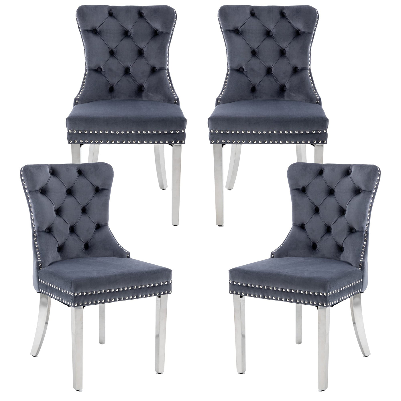 Goolon Dining Room Chairs Set Of 4, Tufted Velvet Chairs With Modern Stainless Steel Legs, Rivet Trim Metal Pull Ring Large Back