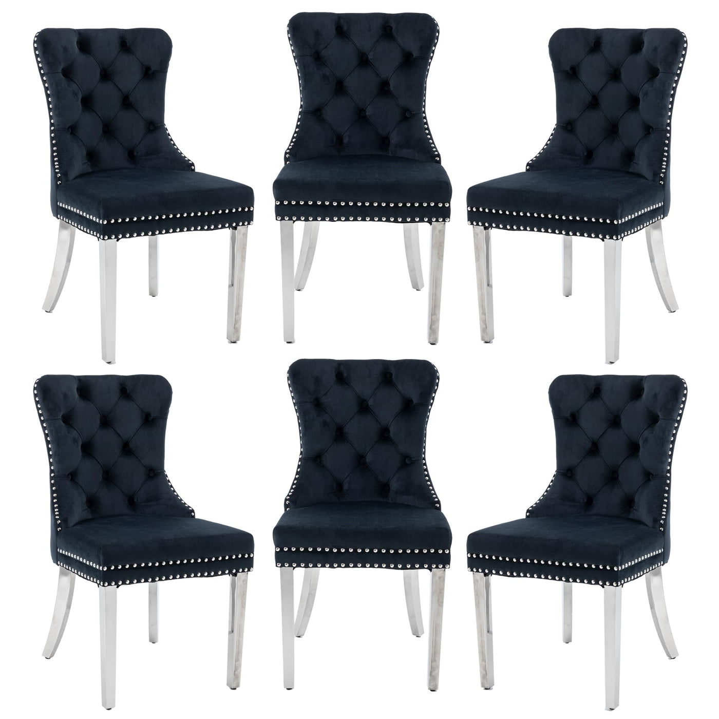 Goolon Dining Room Chairs Set Of 6, Button Tufted Velvet Chairs With Modern Stainless Steel Legs, Rivet Trim Metal Pull Ring Bac