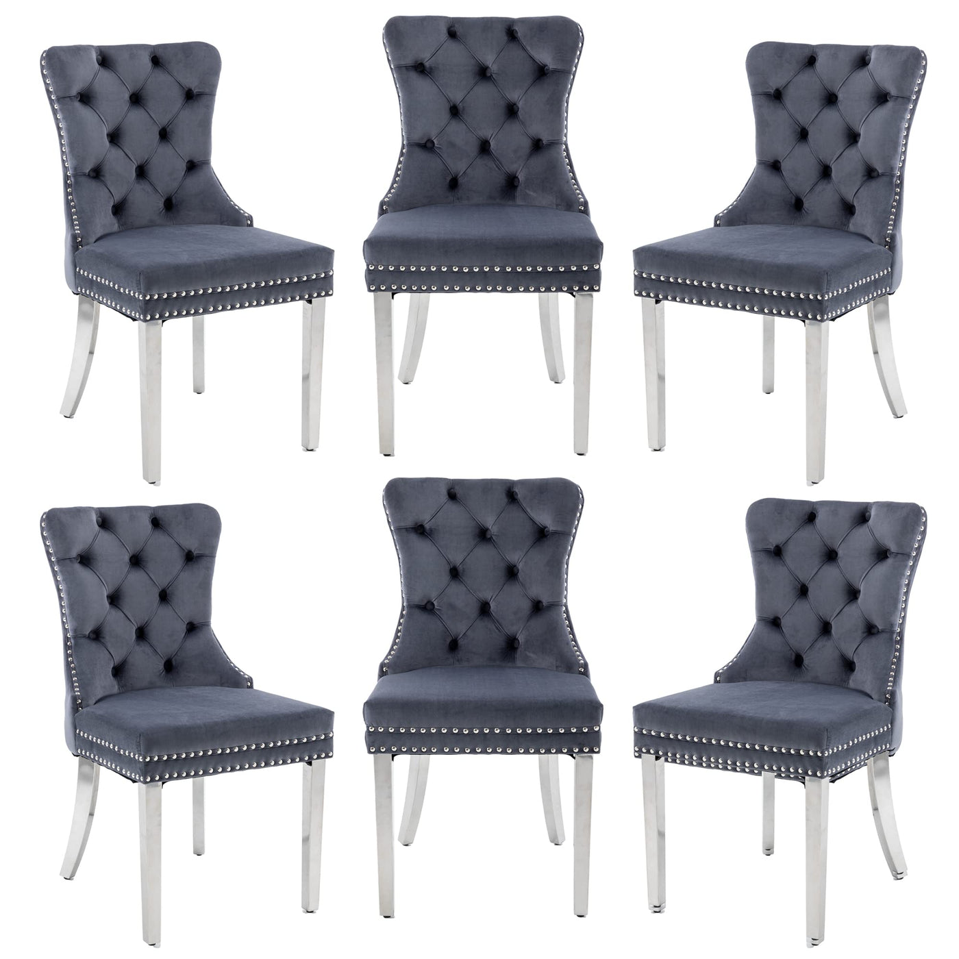 Goolon Dining Room Chairs Set Of 6, Tufted Velvet Chairs With Modern Stainless Steel Legs, Rivet Trim Metal Pull Ring Large Back