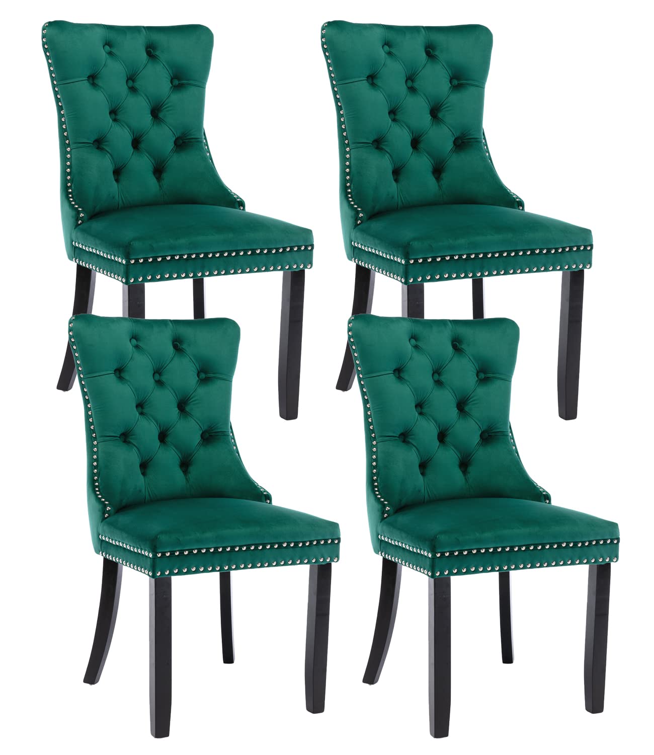 Green Velvet Dining Chairs Set Of 4, Upholstered Dining Room Chairs With Back Ring Pull Trim And Solid Wood Legs, Tufted Wingbac