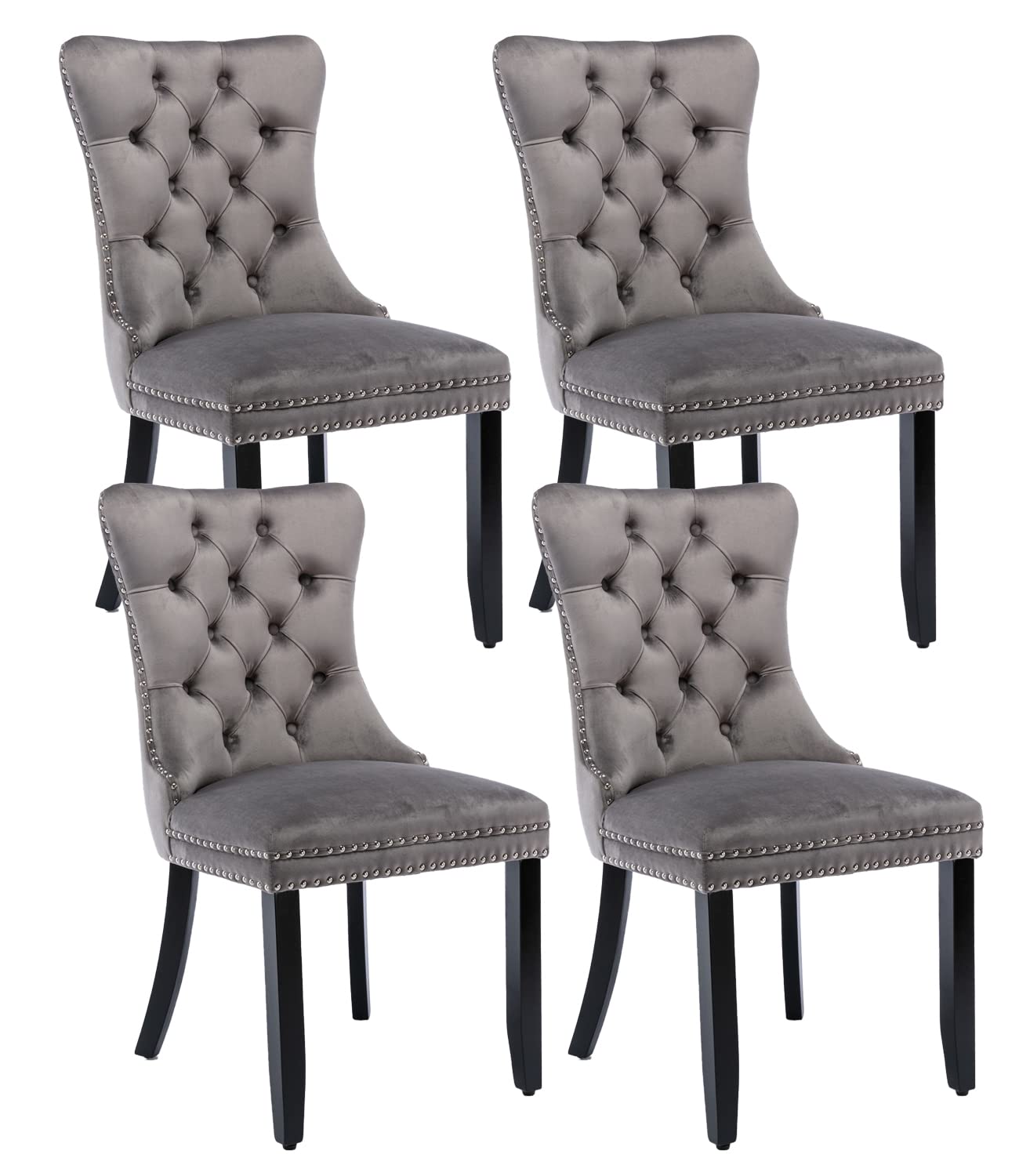Grey Velvet Dining Chairs Set Of 4, Upholstered Dining Room Chairs With Back Ring Pull Trim And Solid Wood Legs,Tufted Wingback