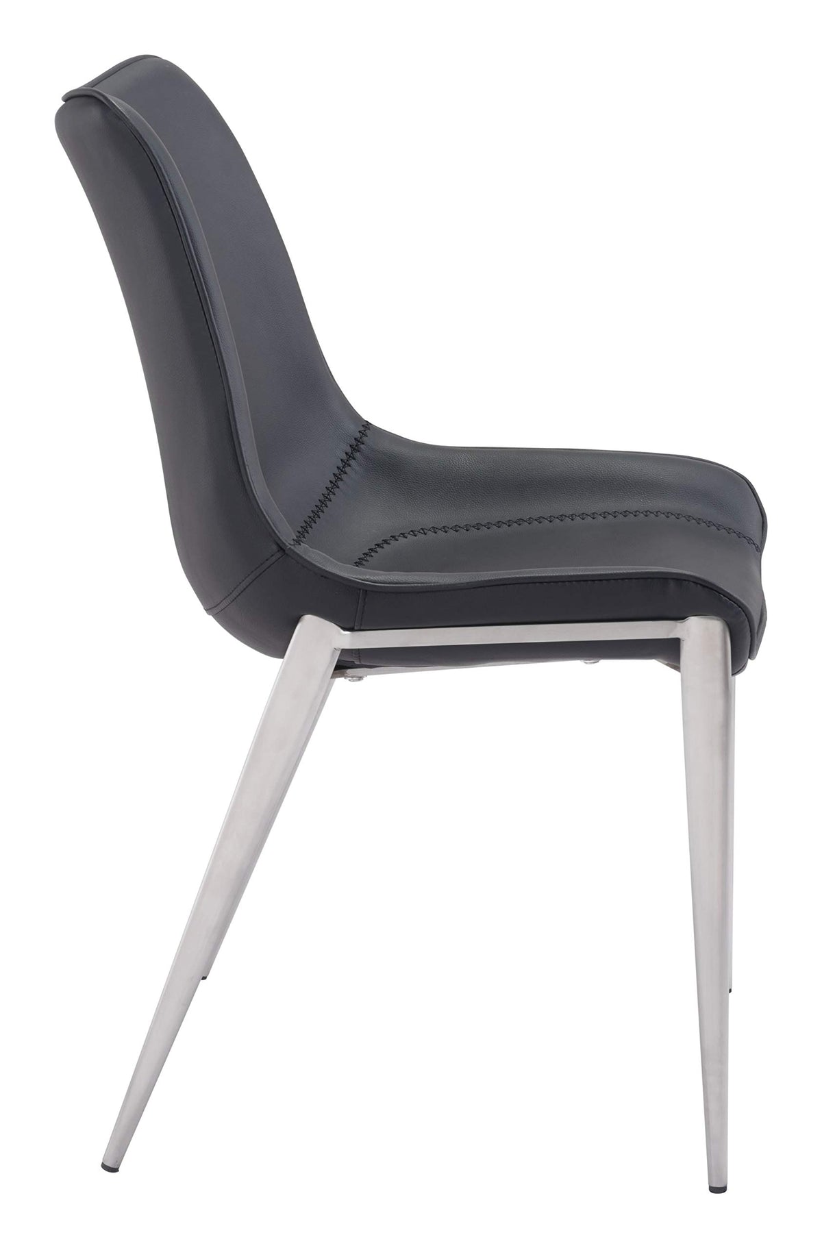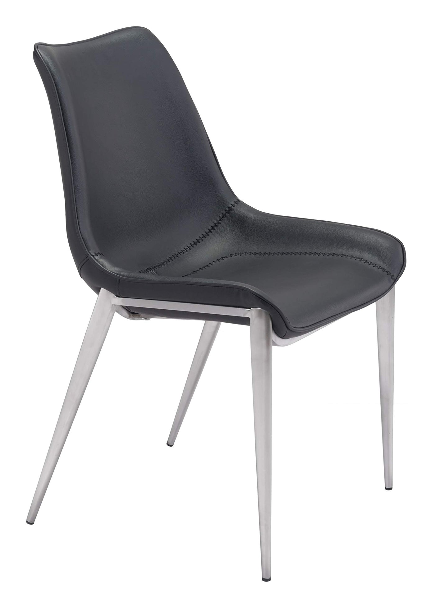 This armless contoured chair with its simple silhouette can dress up your dining space or keep things casual. Beautifully stitched design on black faux leather keeps an eye on the details. Comfortable enough to use as a desk chair. Brushed stainless steel legs are complete with protective plastic feet to keep your floors scratch-free.