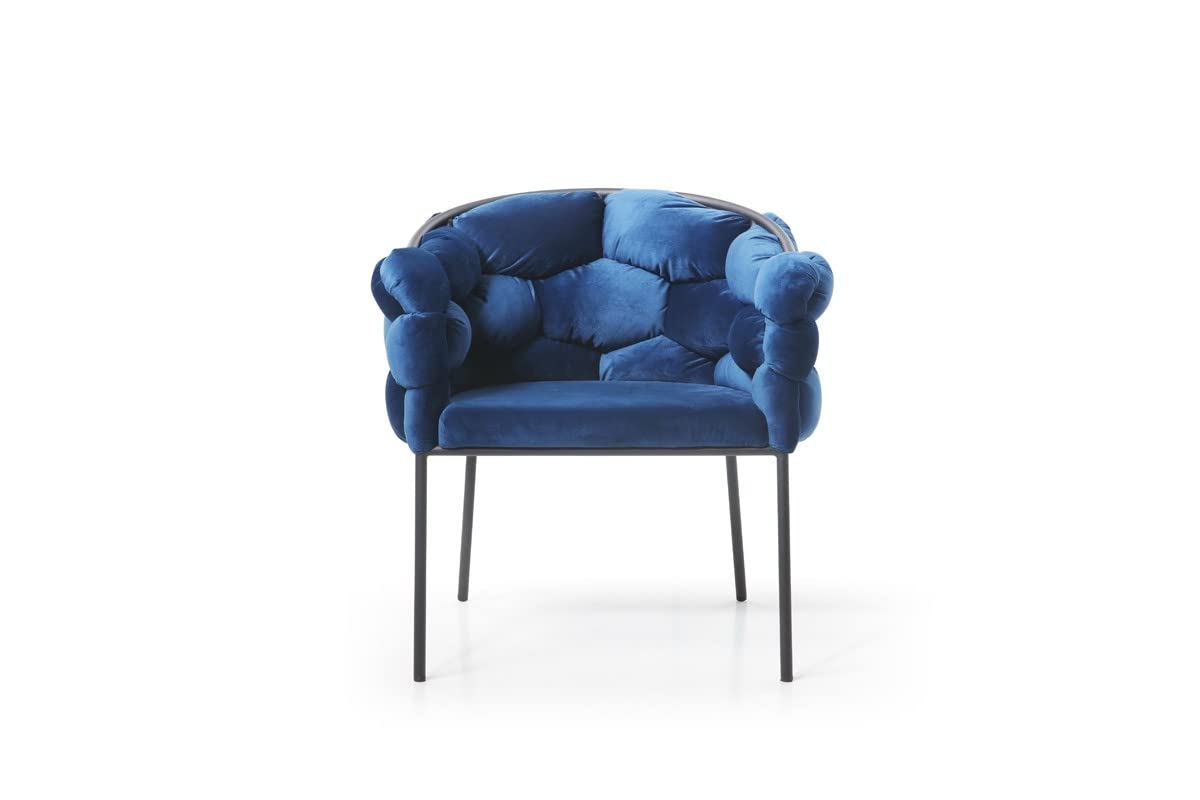 Add style and a striking visual touch with the Blue Geo Velvet and Black Velvet Dining Chair. This uniquely designed dining chair features a tubular metal frame with a modern black finish that envelops you in comfort. The velvet back and arms are sewn into geometric hexagonal cushions to give you comfort and create a super unique and interesting look. The padded seat itself is padded with a thick foam, adding to the comfort and support that this chair brings. This chair is more than a dining chair and will also be an eye-catching accent chair in the living room, office or bedroom. 32'H x 26'W x 23'D